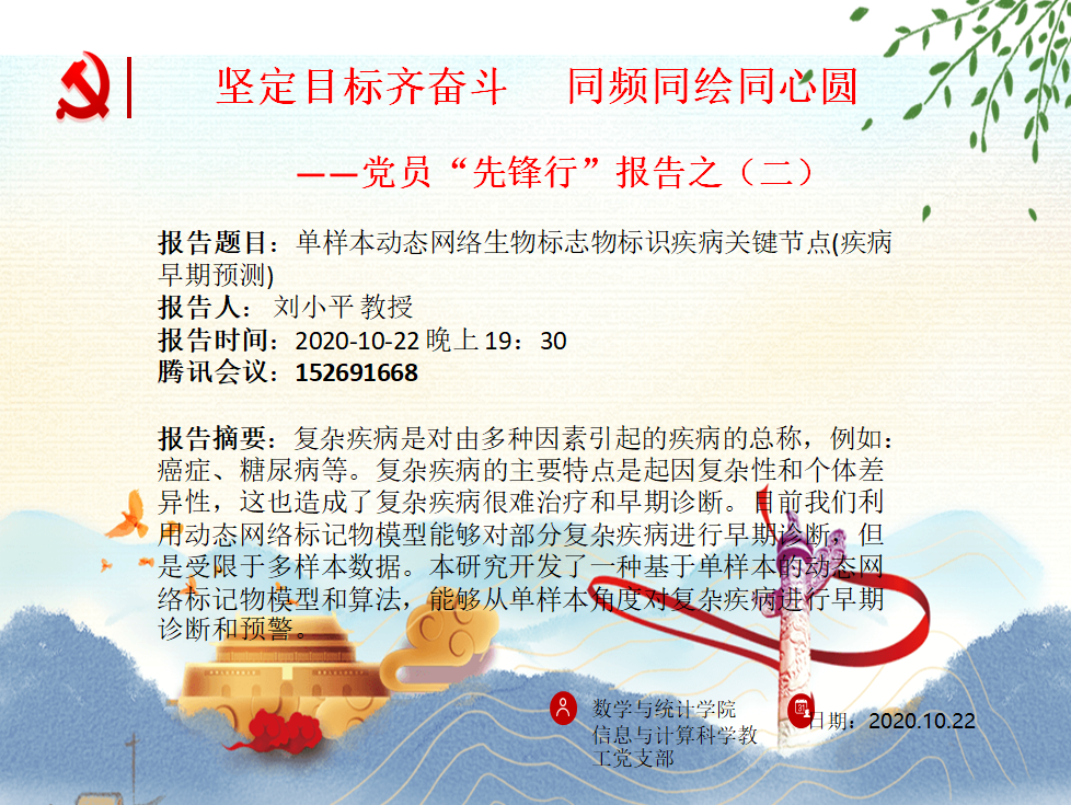 本站讯 为进一步发挥党员先锋引领作用,团结带领师生同心同向同行,共同促进学院及学校事业发展,2020年10月22日晚19:30,KY开元集团官网信息与计算科学党支部组织开展了第二期“坚定目标齐奋斗 同频同绘同心圆——党员‘先锋行’报告”。本次活动由信息与计算科学系教工党支部书记亓兴勤主持,支部党员刘小平教授担任主讲人,信息与计算科学系教师及学院信息与计算科学系部分学生参加。