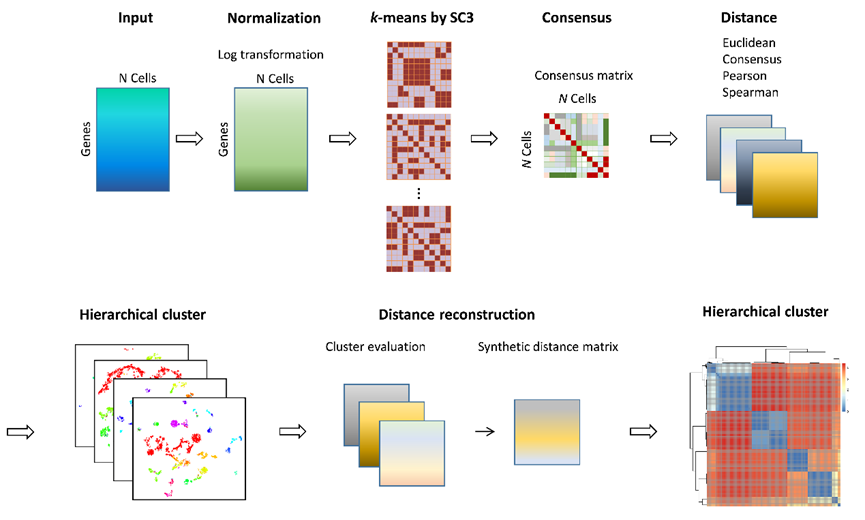 首先,该方法基于一致性聚类(SC3),分析了不同距离测度对10个常用的单细胞基因表达数据集聚类结果的影响。结果发现,不同的距离度量方法对不同类型的基因表达数据的效果是不同的。基于此,该研究旨在为不同scRNA-seq数据集在聚类前定义适合它的最优距离度量,精准捕获细胞之间的相似性,从而实现高精度聚类。如下图所示,本文设计了SD-h算法,该算法可以通过计算d-score的分数来评估各种距离测度的可靠性,然后通过对多个距离测度进行优化综合,重构出新的综合距离矩阵。SD-h在重构的综合距离矩阵的基础上,采用层次聚类,得到了更可靠的聚类结果。
