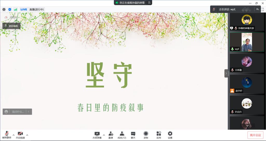 辅导员王紫山、赵宇轩、魏佳佳、王祎璠结合工作实际,从不同角度分享了疫情防控20天里学工一线工作者的心路历程,“守护全体同学健康平安”是他们最大的信念,从他们的讲述中充分彰显了学工队伍的责任与担当。教师代表卢红克服居家困难,精心备课,在保障教学质量、坚守教学岗位的同时,她也尽自己所能,帮助社区工作者汇总物资清单,建立物资台账,她说“疫情当下,尽自己所能,能做一点就多做一点”;而他的先生在烟台白天线上教学,晚上作为志愿者在社区值守,不仅坚守在育人一线,还坚守着一名普通党员的责任和信仰。