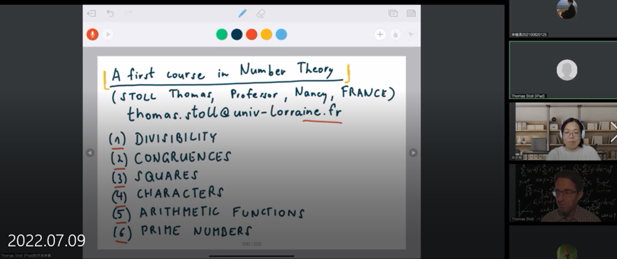 《数论第一课》由孙庆峰教授作为课程负责人,由来自法国洛林大学的Thomas Stoll教授主讲,全英文授课。本课程系统地介绍初等数论的基本理论、方法和思想,主要内容包括七个部分,可除性:最大公约数、最小公倍数、Euclid算法、素数;同余:Fermat小定理、Euler函数、生成元、中国剩余定理;平方:Legendre符号、Euler公式、Jacobi符号、平方模n;特征:定义、Dirichlet特征、Gauss和、本原特征;算术函数:Mobious函数、可乘函数、除数函数;素数、Chebyshev定理、Mertens定理以及其它相关课题。该课程开拓了学生的国际视野,注重提高学生的整体科研素质和创新能力。通过本课程的学习,同学们不仅了解了初等数论的核心理论和基本方法,而且提高了科研兴趣和科研能力。