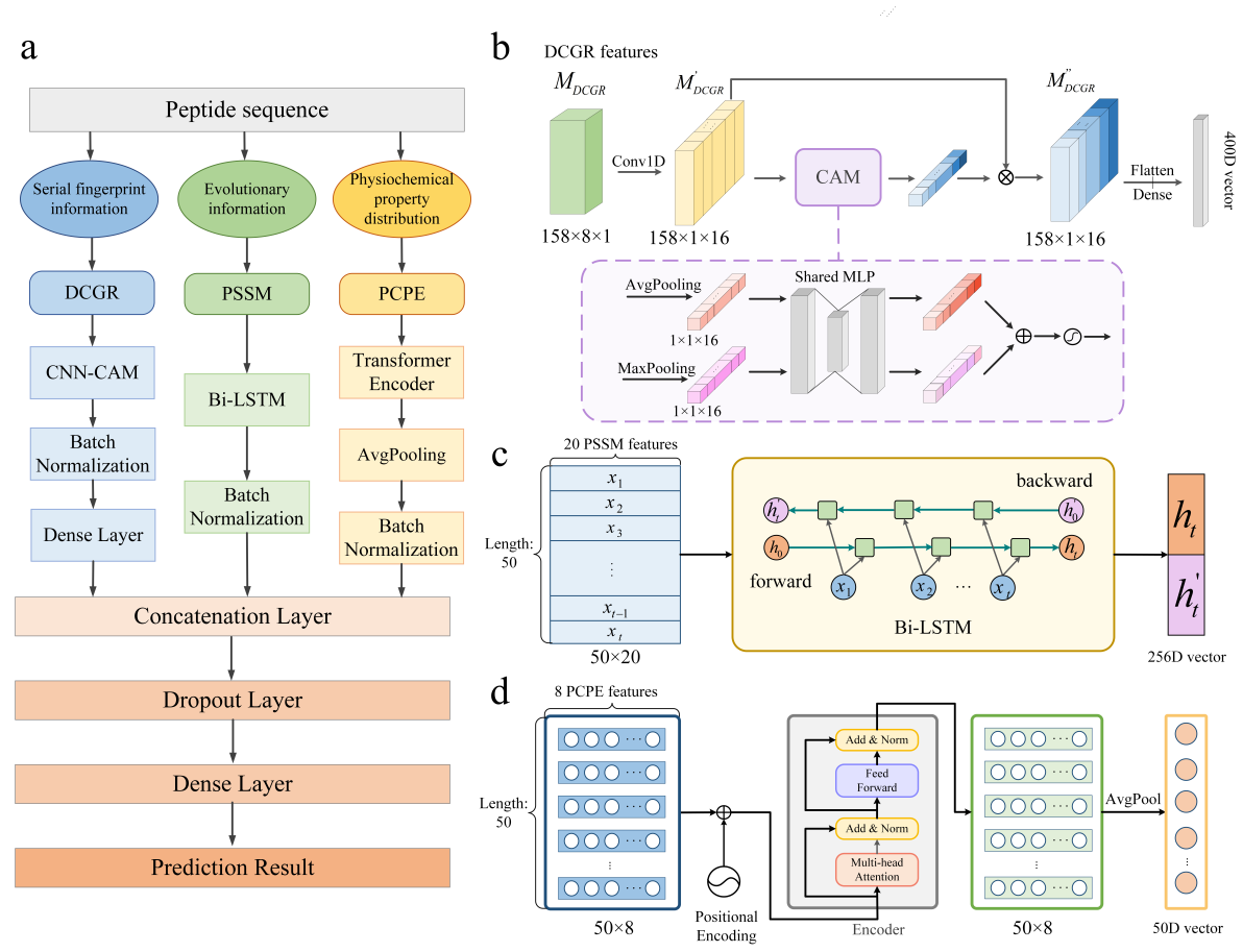 1.在特征提取方面,没有能够体现肽链全局信息的特征,同时,在理化性质特征提取方面常常直接使用特定的理化性质特征,造成序列特征信息的冗余和低质量。