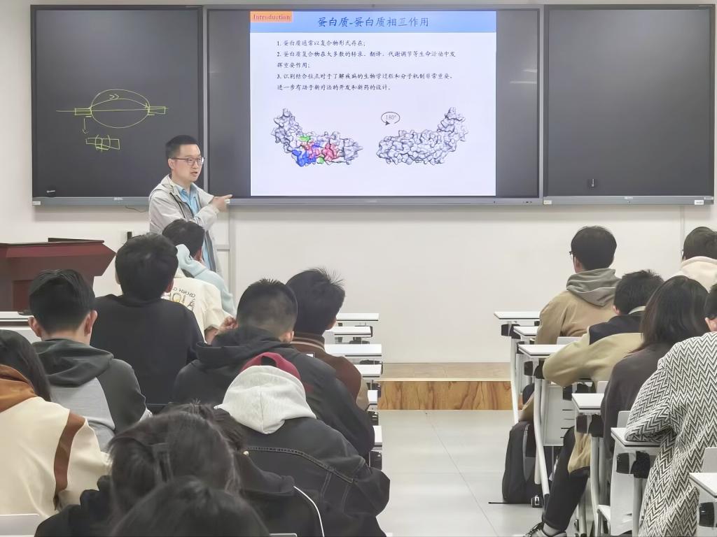 柳军涛以“生命科学中的数学问题”切入主题,结合相关的课题研究进行了深入浅出的讲解,分享了生物信息学的相关知识,着重谈到了数学在生命科学研究中的作用发挥。他分别以研究领域“转录组拼接”和“蛋白质间的相互作用”为例,生动地讲述了RNA的剪切与拼接这一生物过程和数学方法在蛋白质作用位点识别上的预测思路与相关算法。柳军涛讲到数学在生命科学领域应用广泛,数学方法在生命科学相关问题的研究和分析上具有独特优势。他鼓励学生要加强学科交叉学习研究,学会用数学问题去解决各种现实问题。在现场交流互动环节,柳军涛就大家的提问和困惑进行了详细而又生动的解答。