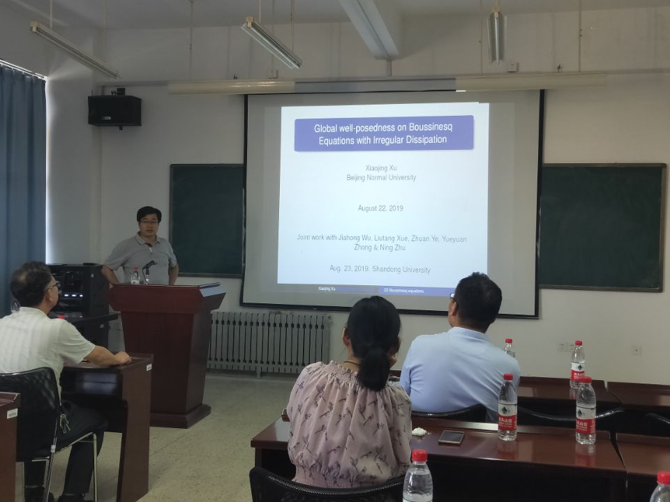 报告中,许教授系统地讲解了Navie-Stokes方程,欧拉方程等问题的全局适定性,详细介绍了具有分数阶的2D Boussinesq system,并给出全局适定性问题讨论的结果。报告结束后,许教授与我院教师就相关问题进行了热烈的讨论。