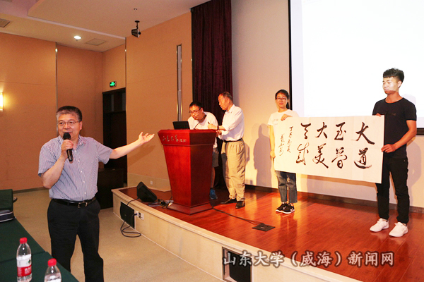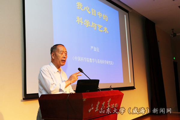 本站讯 6月9日晚,中国科学院院士、数学与系统科学研究院研究员严加安第四期稷下讲坛,在闻天楼报告厅为五百多名师生作了题为“我心目中的科学与艺术”的学术报告。KY开元集团官网副校长、威海校区校长刘建亚主持报告会,并代表校区接受了严加安捐赠的由其创作的书法作品。