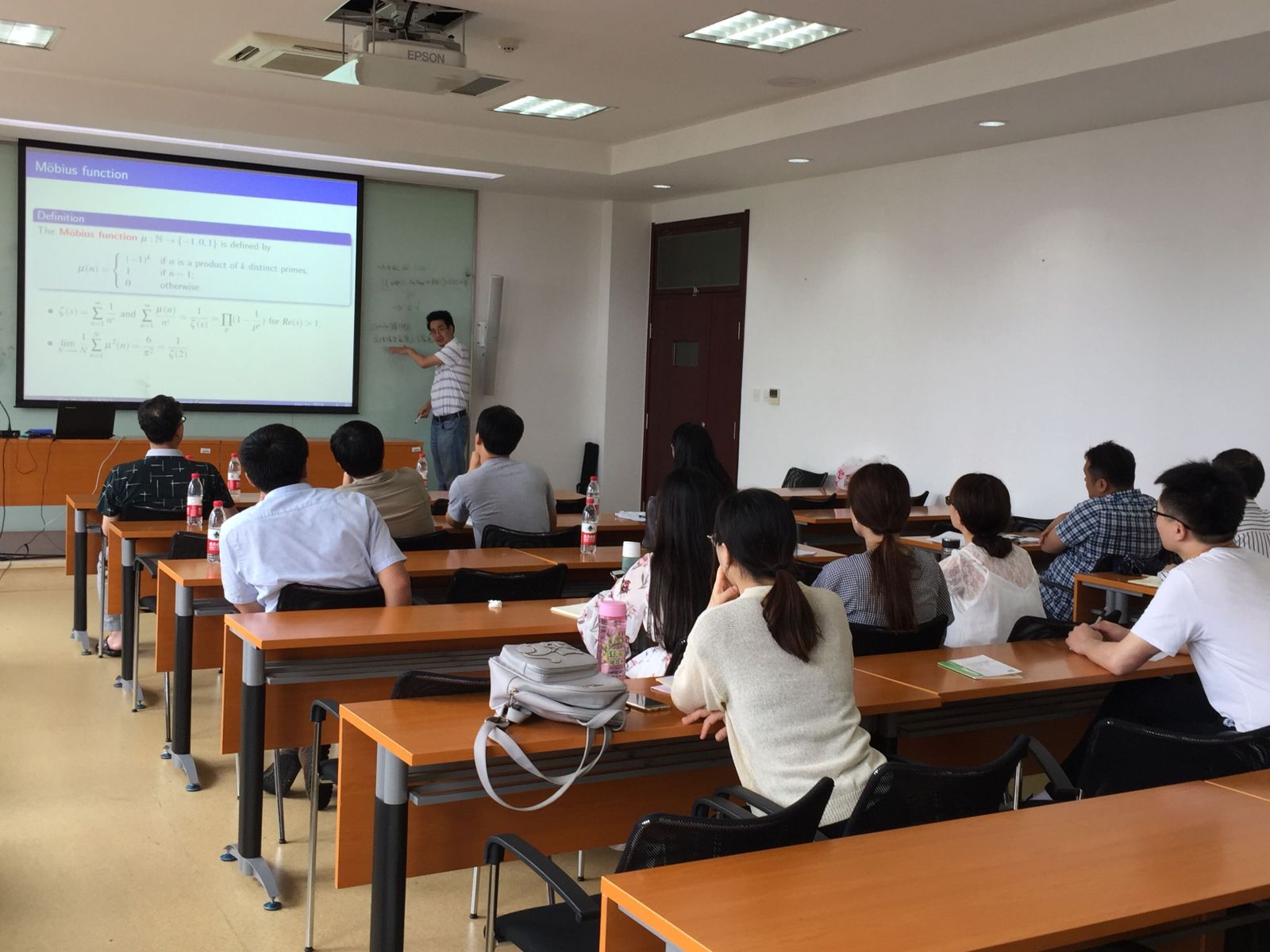 黄文教授的报告系统地给大家讲述了数论与动力系统的关系,并用数论的相关知识解决动力系统中的问题。在7月9号题目为“自然数大子集中的线性结构”中,黄文教授综述自然数大子集中的线性结构的相关进展,主要介绍了正上半Banach密度子集中等差数列公差构成集合的结构,以及两个素数的差组成的集合的结构,并进一步重点阐述了他们与动力系统中高阶Poincare回复定理、特定动力系统点的回归时间等之间的关系。通过黄文教授的第一个报告,我们了解到数学的各个分枝是融会贯通的,知识是彼此相通的。在7月11号,黄文教授题为“测度复杂性和莫比乌斯函数不相交性”报告中,重点讲述了数论与动力系统相交叉的一个猜测,即Sarnak关于莫比乌斯不交性的猜测。首先黄文教授先简短的介绍了Sarnak猜测相关的背景和最近的一些进展;然后对一个动力系统不变测度引入测度复杂性的概念,介绍其最近与叶向东教授,王之任教授合作的一个结果。此报告让师生对此方面的问题有了进一步的认识。在最后一个题为“Stable Sets and Chaos in Positive Entropy Systems”报告中,黄文教授给出一个具有正熵的动力系统的混沌现象。黄文教授首先采用通俗易懂的语言为我们讲解了当一个动力系统具有弱马蹄形时,它具有正熵这一现象。随后又举例说明洛伦兹吸引子具有弱马蹄形,方便我们对上述现象的理解。此外,黄教授还介绍了C1微分同胚系统的Hausdorff维数以及稳定集和不稳定集的混沌行为具有正熵。在此报告中黄教授还讲了自己的研究经历,借此鼓励我们认真学习,平常心对待科研压力。