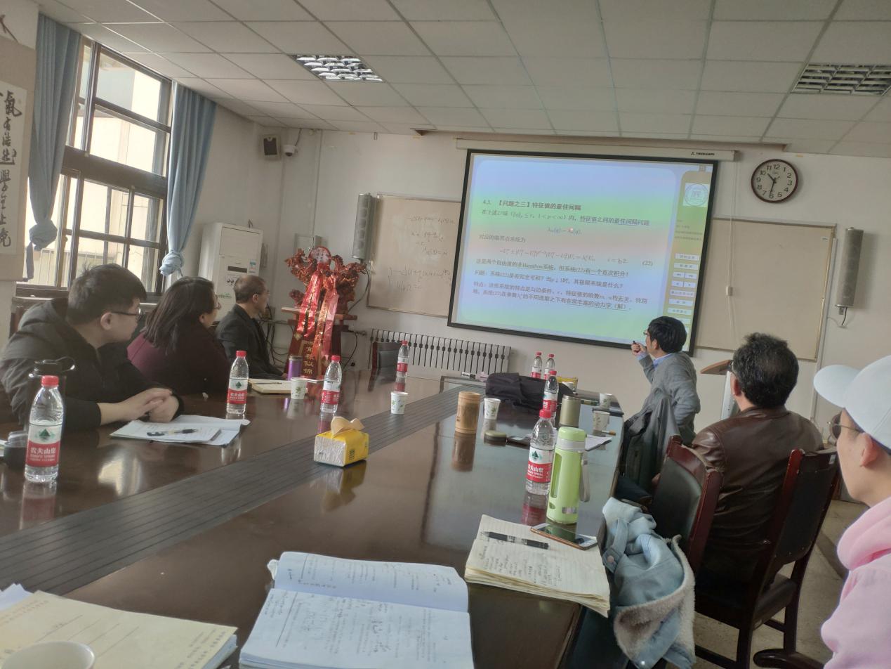 报告中,章梅荣教授从物理模型、动力系统、特征值问题、具体应用等方面展开了自己的报告。首先章老师从物理中力学问题、能量问题引出动力系统:旋转p-Laplacian,成功的吸引了大家的注意力,并且采用通俗易懂的语言为我们介绍了特征值的依赖关系:连续可微性和完全连续性,将报告内容引入到最新微分方程和动力系统研究的前沿问题上。最后章教授给出此类问题的具体应用和未解决及可以继续研究的问题结束本场报告。讲座层层深入,环环相扣,引人入胜。