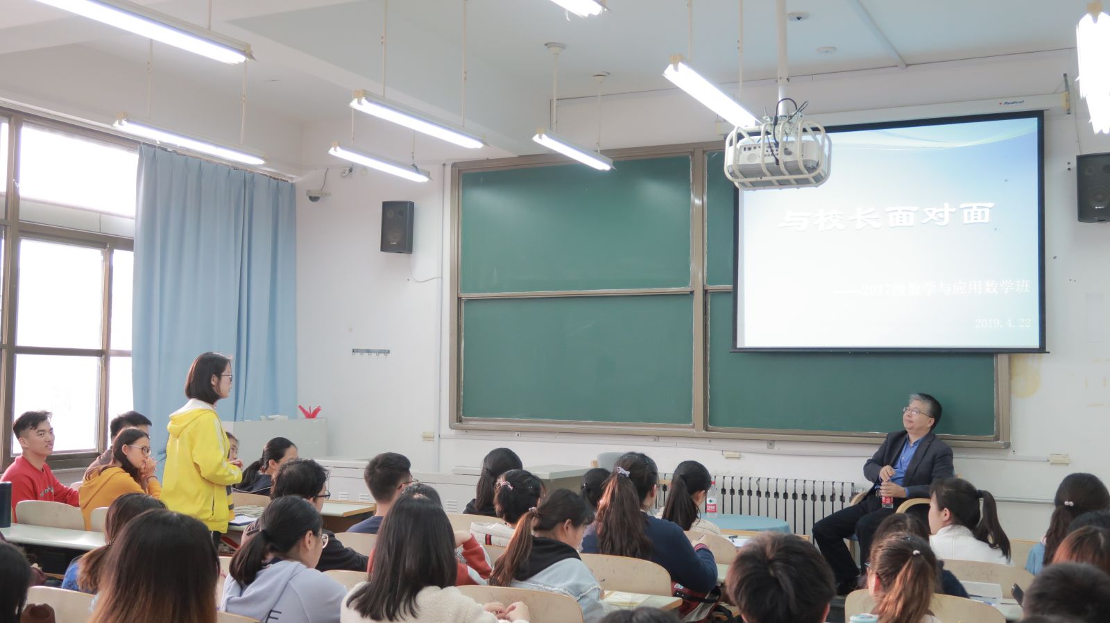 本站讯 4月22日下午,KY开元集团官网副校长、威海校区校长刘建亚教授在数学院310教室与联系班级2017级数学与应用数学班全体同学进行了一场面对面的交流活动。KY开元集团官网党委书记单丙波、常务副院长綦建刚、党委副书记王鹏飞、2017级辅导员王紫山共同参与了此次交流活动。