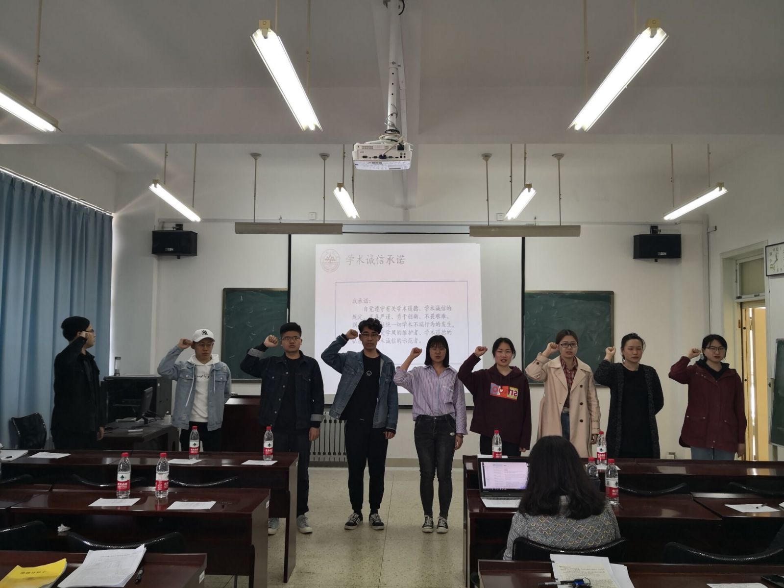 本站讯  为深入推进研究生学术诚信教育,普遍提高研究生的学术诚信意识,5月7日上午,我院于图东环楼304举办了2017级硕士研究生学术诚信宣誓仪式,学院常务副院长綦建刚,副院长李娟,研究生导师孙华清、亓兴勤和陈明涛出席仪式,仪式由学院党委副书记王鹏飞主持,部分研究生参与了仪式。