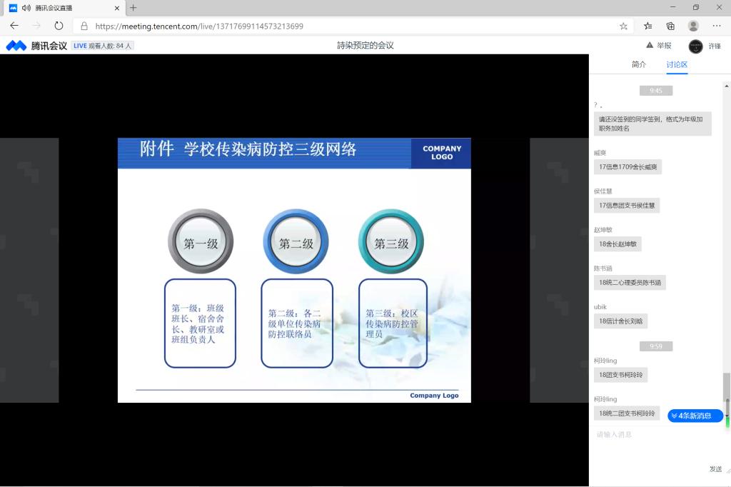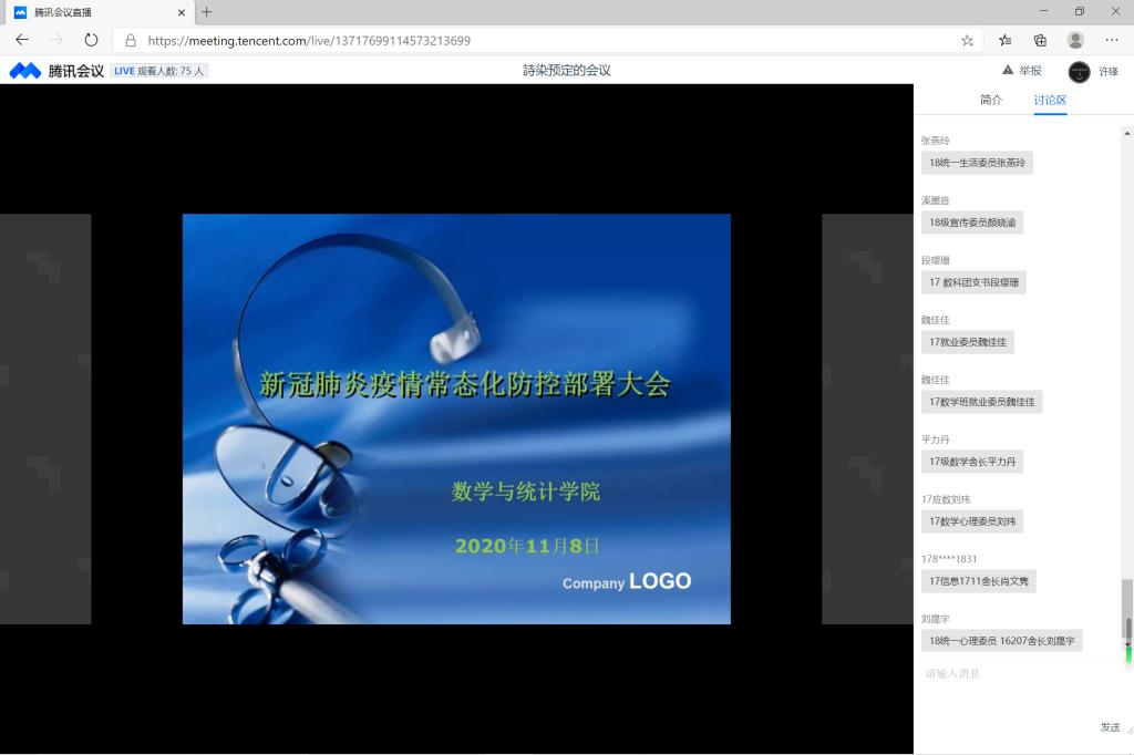 本站讯 为进一步强化学生思想认识,落实好新冠肺炎疫情常态化背景下各项举措,推进学生网格化管理服务体系建设,11月8日上午,我院通过腾讯会议召开了新冠肺炎疫情常态化防控部署大会。学院党委副书记王鹏飞,辅导员孙磊、王祎璠、王紫山、古钰出席会议,学团中心全体成员、各年级全体班委、宿舍长参加会议。