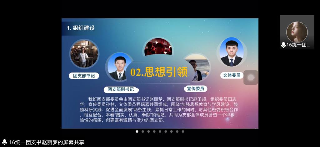 本站讯 2020年4月6日下午,我院依托腾讯会议举办定级评优风采展,对学院各团支部2019年度的各项工作进行总结评定。学院党委副书记王鹏飞、学院团委书记孙磊、辅导员王祎璠、赵德豪、王紫山、古钰列席本次活动,全体团支部书记担任本次活动的评委,学生会支部委员、各社团支部委员以及各班级团支部委员参加活动,活动由刘馨野主持。
