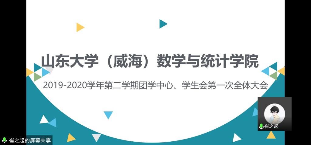 本站讯 3月19日下午,为总结团学中心、学生会上学期及疫情期间的工作并对后续工作进行展望,我院使用腾讯会议软件举办线上学团全体会议。大会由崔之起主持,学院团委书记孙磊、辅导员赵德豪参加了本次会议。学生会、团学中心全体成员参加了本次会议。