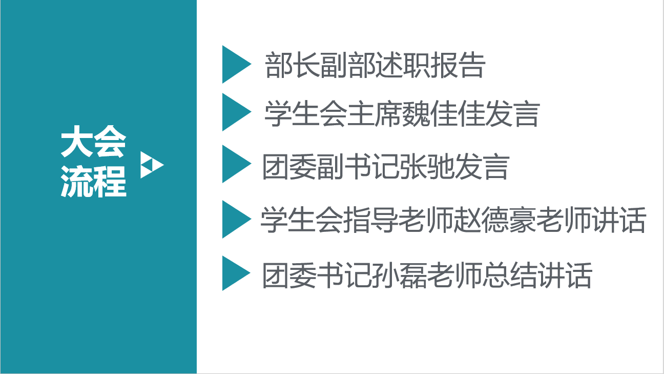 会议伊始,主持人向全体同学介绍了本次大会的流程,并宣布会议开始。首先,各部门部长做述职报告,介绍上学期的工作,总结获得的成绩以及发现的问题,并汇报本学期的工作计划。接着,学生会主席魏佳佳发言,肯定了学生会各部门的工作,指出大家在疫情期间也要配合学生工作,弘扬自身优点并转化为自身能力。团委副书记张驰发言,回顾并对团学中心各部门的工作表示认可,强调大家应团结一致,并肩前行,言论严谨,严格要求,做好时间规划。之后,赵德豪与大家进行了交流,指出学生干部首先要做好学生的本职工作,在疫情期间坚守自己的本心,将在家学习生活当做提升自我的契机而不是逃避的借口,要以积极饱满的心态,为同学服务的态度执行工作,收获成长。最后,孙磊总结讲话,强调应把握工作方向,明确工作目的,对学生组织成员的身份有认同感,在工作中呈现出的问题要有总结与反思。
