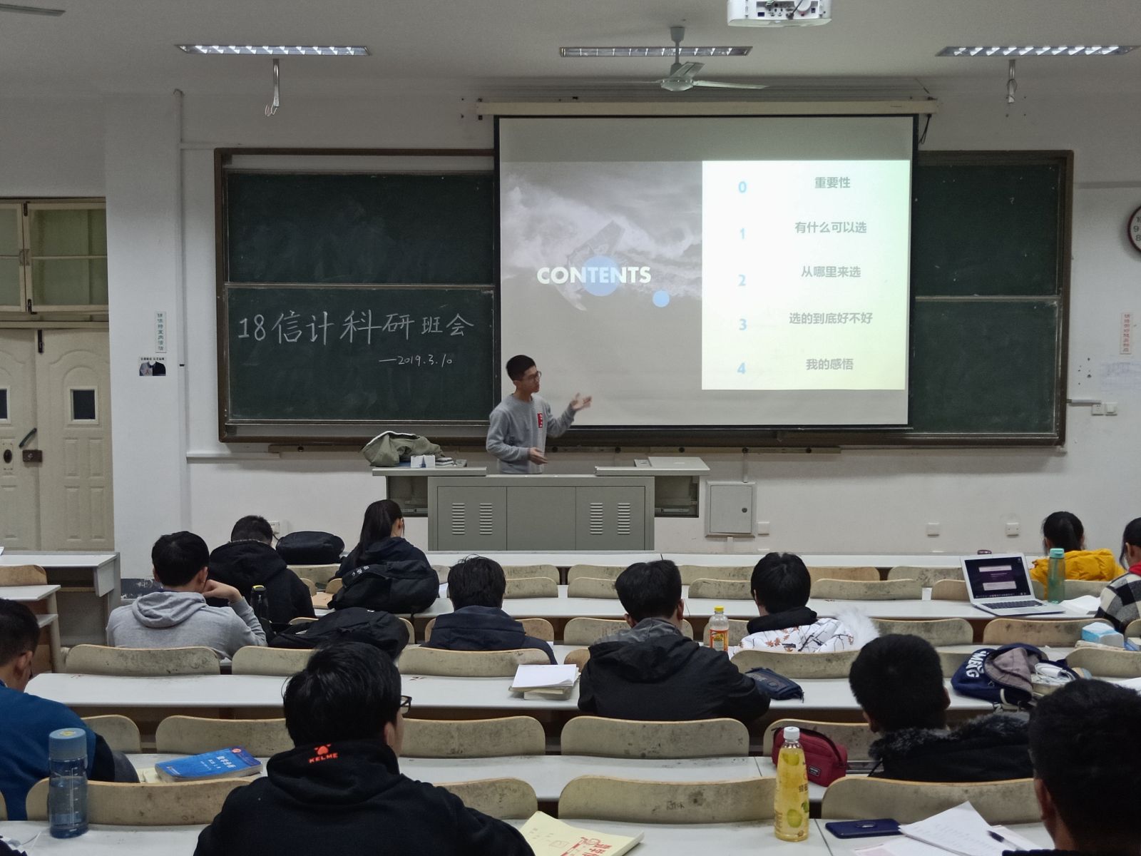 刘昱在本次班会主要讲述了选题和组队的问题,由“好的开始是成功的一半”这句话引出了对选题专题的讲述。刘昱首先提供了可供参考的选题类型,再从选择途径切入,由此引出科研选题的五大原则:必要性原则、创新性原则、科学性原则、实用性原则和可行性原则。他以自身为例,向同学们讲述了他本人关于选题的一些感悟。在组队专题的讲述,刘昱在讲解一些基本的选人原则后提出了“先组队还是先选题”的问题,并在进行了相应询问后给出了自己的看法,介绍了一个优秀团队所应该具有的素质。最后,刘昱通过播放«微信红包先抢和后抢差距居然这么大»这个幽默风趣的视频来加深同学们对于科研的兴趣。