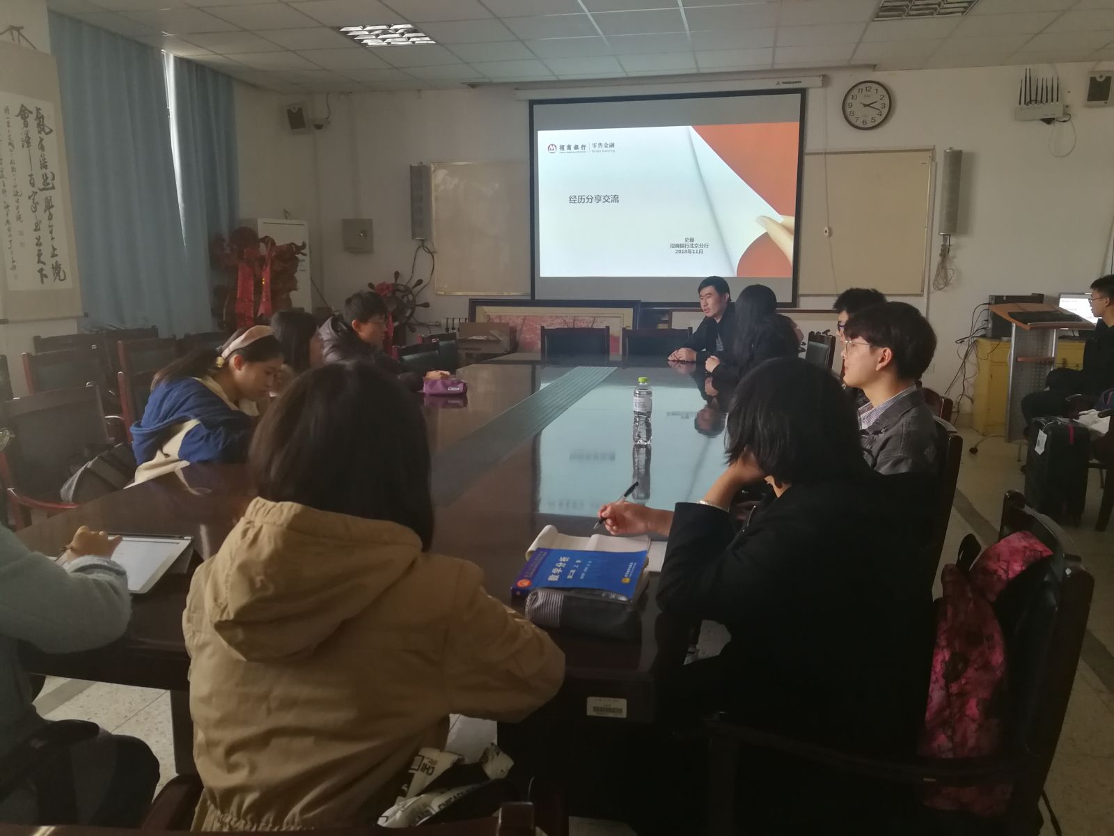 本站讯 2018年11月18日下午,我院于图东环楼208室举办了有关双学位和就业的经验交流会。辅导员孙磊出席了此次讲座,学院2014级毕业生,现就职于招商银行北京分行的史磊回母校主讲此次讲座,学院部分学生参加了此次讲座。