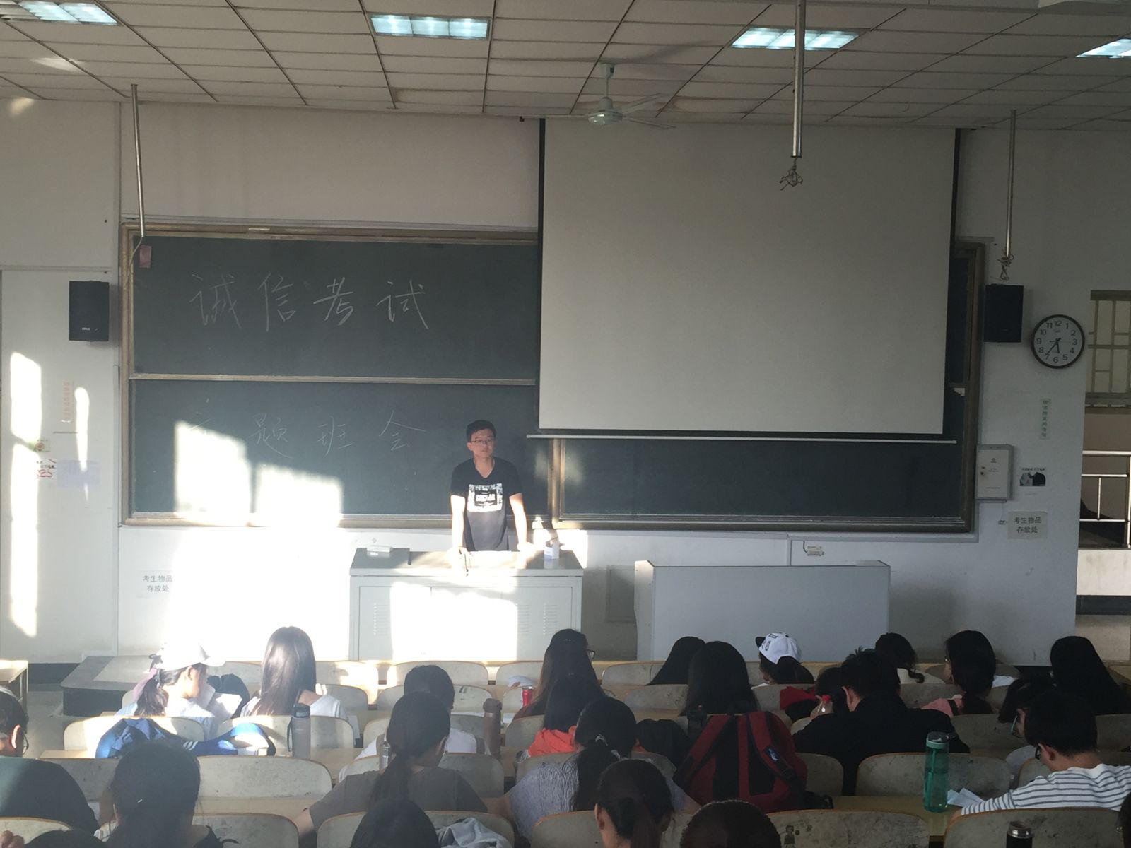 下午五点二十分,活动准时开始。活动分为三个部分。首先,龚健欢向同学们强调了本次活动的主题:诚信考试。并朗读了学校规章制度中有关考试的相关规定。随后,龚健欢在校规基础上指出常见的作弊形式,并再次强调了打小抄、交头接耳等行为的处理方法及严重后果,并通过以往考试作弊同学受到处罚的真实事例为大家敲响警钟,希望同学们能引以为戒,杜绝考试作弊的行为。最后,龚健欢组织全班同学在诚信考试承诺书上签上名字,表明自己诚信考试,杜绝作弊行为的决心。至此,诚信考试主题班会结束。