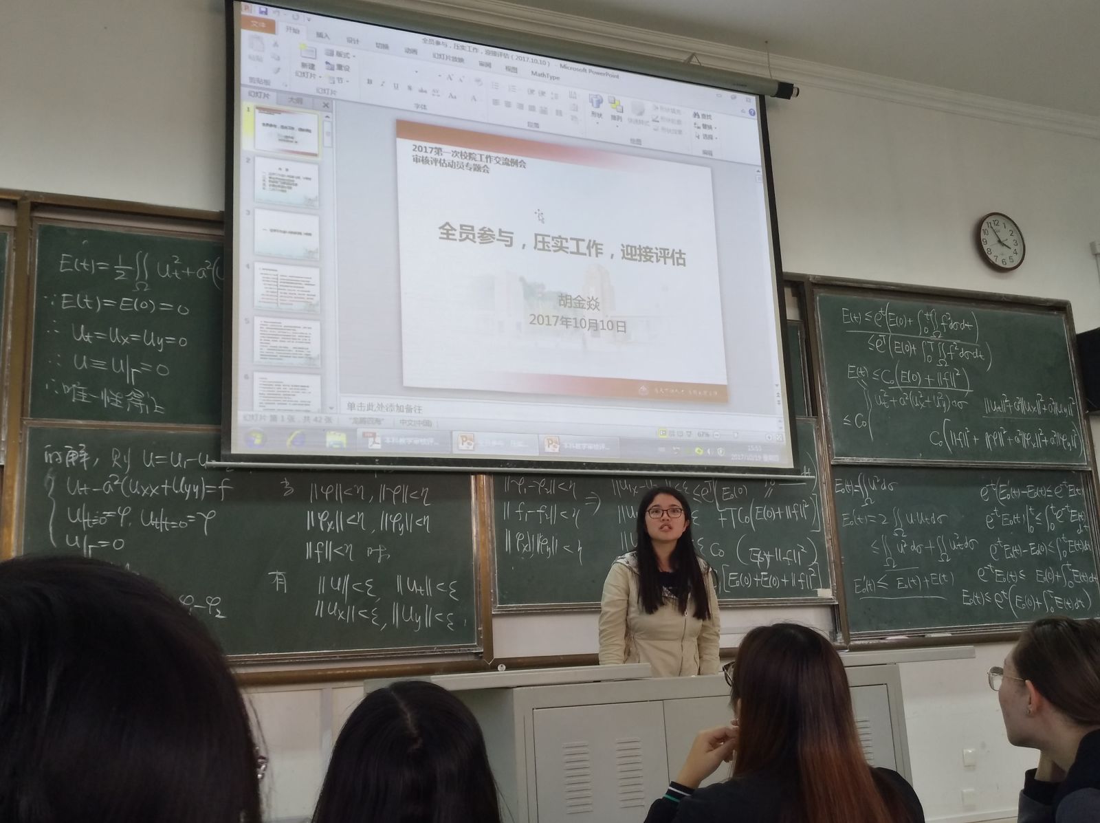 本站讯 2017年10月19日下午,2015级信息与计算科学班于图东教学楼205教室举办“本科教学评估基本知识学习”主题班会,本次班会由团支书欧阳立韩主持,2015级信息与计算科学班全体同学参加。