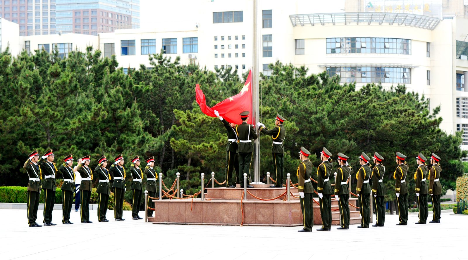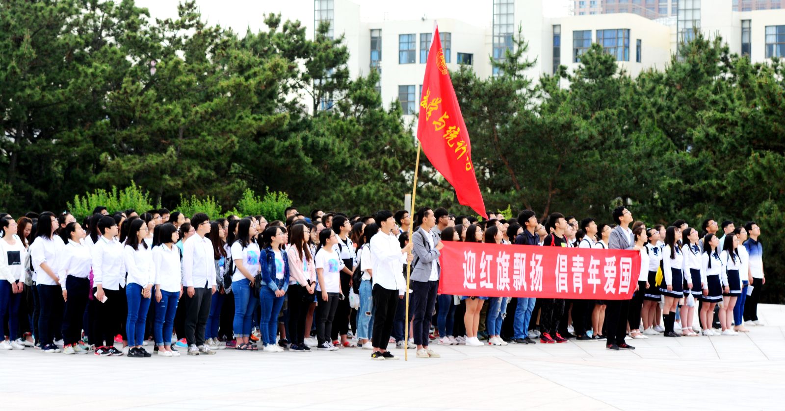 本站讯 2017年6月12日早7点,我院在主楼广场举办“迎红旗飘扬,倡青年爱国”升国旗主题团日活动。学院辅导员孙磊、赵德豪,及2015级、2016级部分支部全体成员参与此次活动。