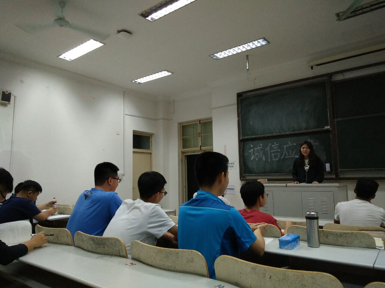 活动伊始,孙妍向大家简要介绍了活动的主要流程及活动目的,并阐释了诚信于大学生的重要意义,介绍了当代大学生的诚信现状。接着,她宣读了学校规范考试纪律的相关规定,强调了考试违规的严重后果。然后,她带领全班同学进行 “诚信考试”宣誓,承诺做到知行统一,遵从学术规范,恪守学术道德;不作弊,不剽窃;自尊自爱,自省自律。最后,孙妍言简意赅地对考试内容进行分析介绍,包括考试范围与学长学姐提供的部分考试建议,让同学们对临近的期末考试有更加充分地准备,减少复习压力。至此,本次班会落下帷幕。