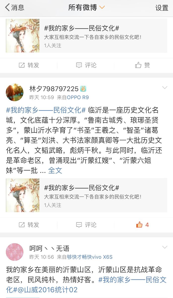 活动伊始,宣传委员朱佳巧通过班级微博发起#我的家乡——民俗文化#话题讨论,并在班级交流群中对本次活动进行宣传和预热,鼓励同学们积极参与。随后,团支部书记王璇在班级交流群中发布活动的具体时间以及相关规则,发动同学们以微博分享的形式,将自己家乡独特的民俗与其他同学进行交流。本次活动采取微博互动这一形式,由班级微博对同学们发布的内容进行转发,实时跟进活动进度。同学们通过微博这一线上平台进行讨论,互相分享各自家乡的民俗文化,积极参与了本次活动。同时,本话题还吸引了众多其他微博用户参与进来,扩大活动平台,增强宣传力度。在同学们线上热烈的讨论中,本次活动落下帷幕。