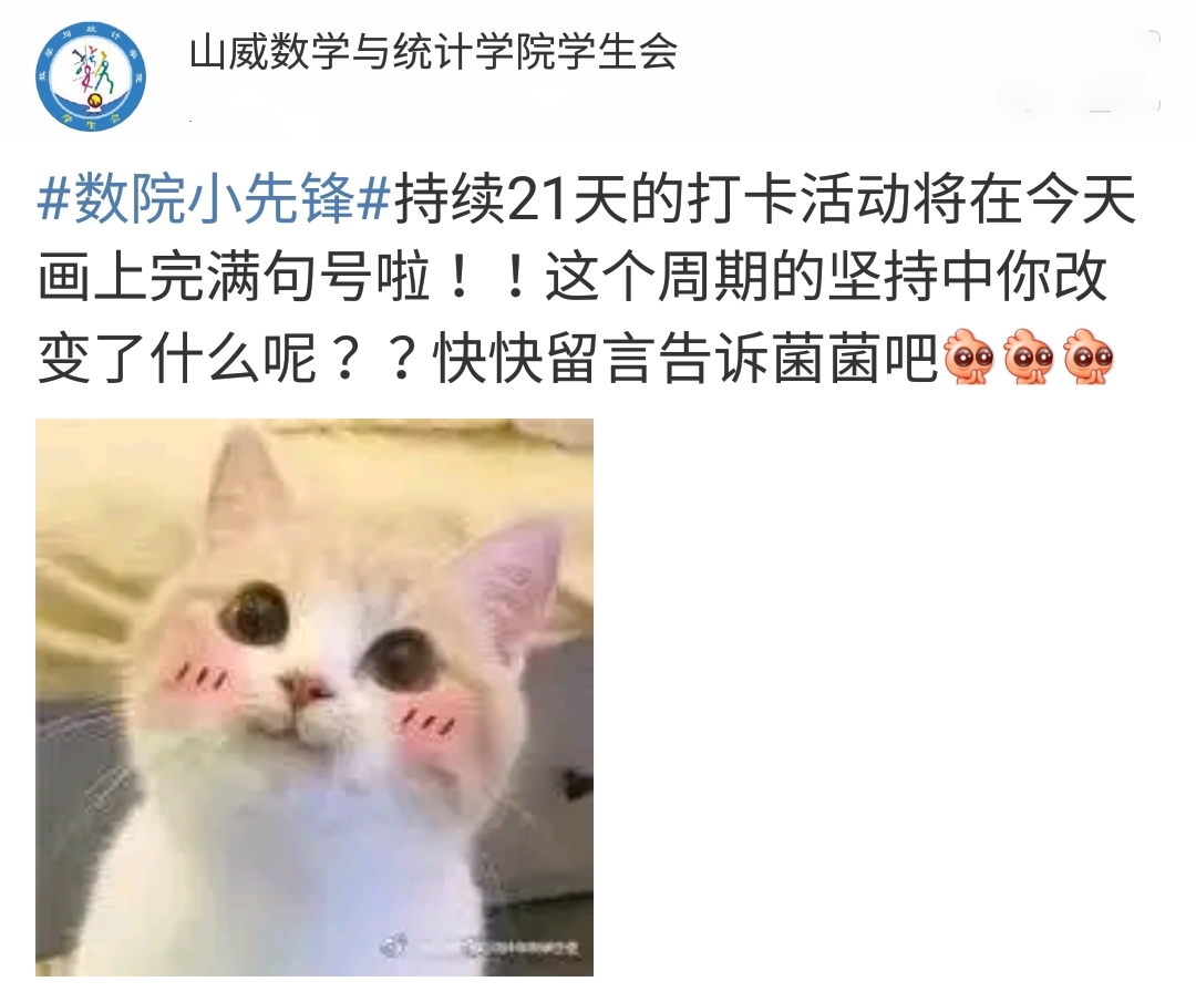 本站讯 4月5号至4月25号期间KY开元集团官网学生会举办了为期21天的“数院小先锋”微博线上打卡活动,学生会全体成员参与了此次活动。