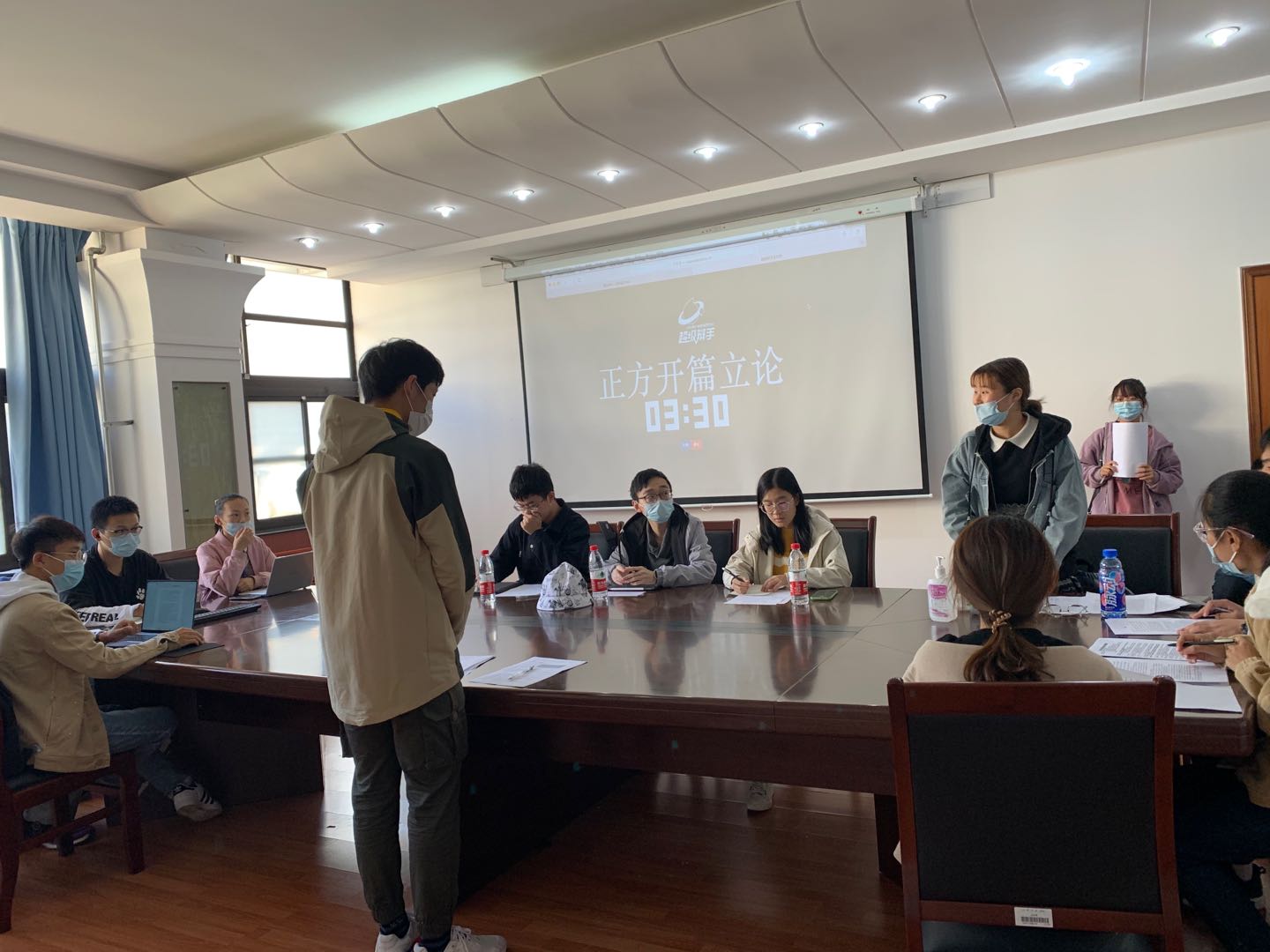 本站讯 10月17日上午,我院于图东环楼216研讨室举办了第一期“数韵风采,谁语争锋”新生辩论赛。本次辩论赛共分两场,第一场由正方2020级数学类二班对阵反方2020级数学类四班,第二场由正方2020级数学类三班对阵反方2020级数学类一班。本次辩论赛由石俊煊担任主席,唐浩博负责计时,其中第一场评委为叶家辉、陈晓姝、薛建恒,第二场评委为丁夏菲、薛建恒、张正泽。