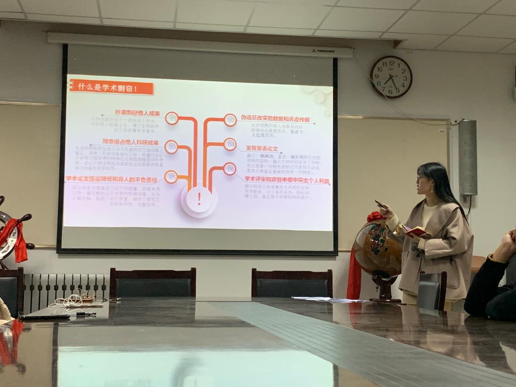 本站讯 11月20日19:00,我院研究生会于图东环楼208举办了以“学术有道,以诚为本”为主题的学术诚信主题班会。本次班会以践行学术诚信、遵守学术道德为准则,力求全体研究生在思想上树立诚信意识,行动上恪守诚信准则。班会由院研会主席王梦冉主持,我院全体研究生参加了此次班会。
