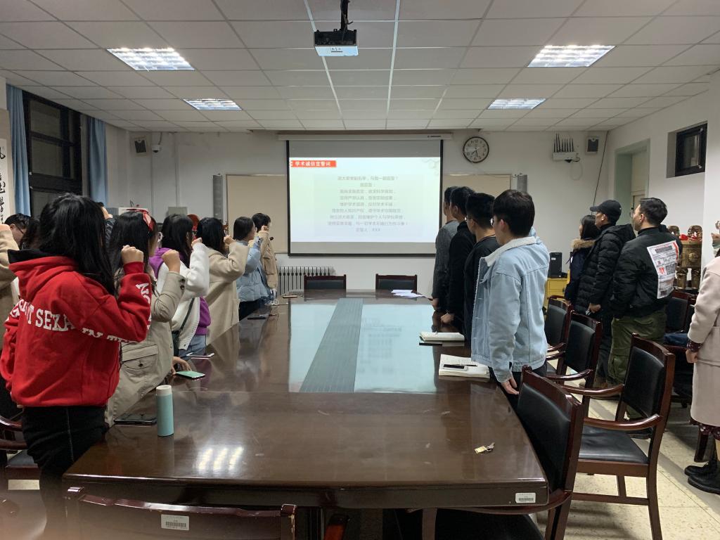 班会伊始,全体研究生认真阅读并签署了学术诚信承诺书,保证端正学风,实事求是,维护学术道德,反对学术不端。接下来,全体研究生一同观看了学术诚信教育视频,响应热烈。王梦冉介绍了科学精神与科研道德的含义,并结合实例分析强调了学术诚信的重要性,以及违反学术道德对自身发展、乃至整个研究领域的重大影响。最后,主持人王梦冉领读学术诚信誓词,全体研究生一同宣誓。作为一名合格的研究生,应当保持严谨认真的科研态度,努力钻研学习,绝不走违反法律违反道德的捷径。