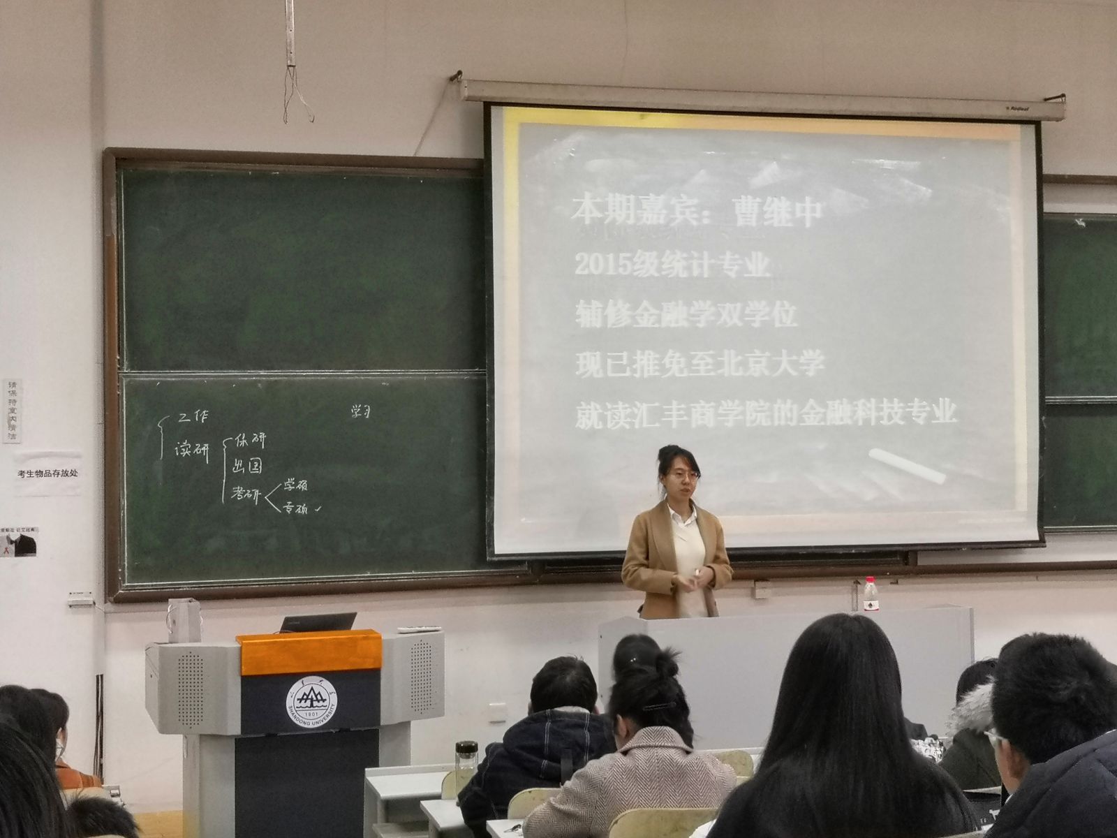 本站讯 3月10日上午,我院“励志周末”座谈会系列活动第一期于图东教学楼126室召开。本次座谈会邀请了学院2015级统计学专业、现已推免至北京大学的曹继中担任主讲嘉宾,活动由刘海凌主持,学院部分学生参与了讲座。