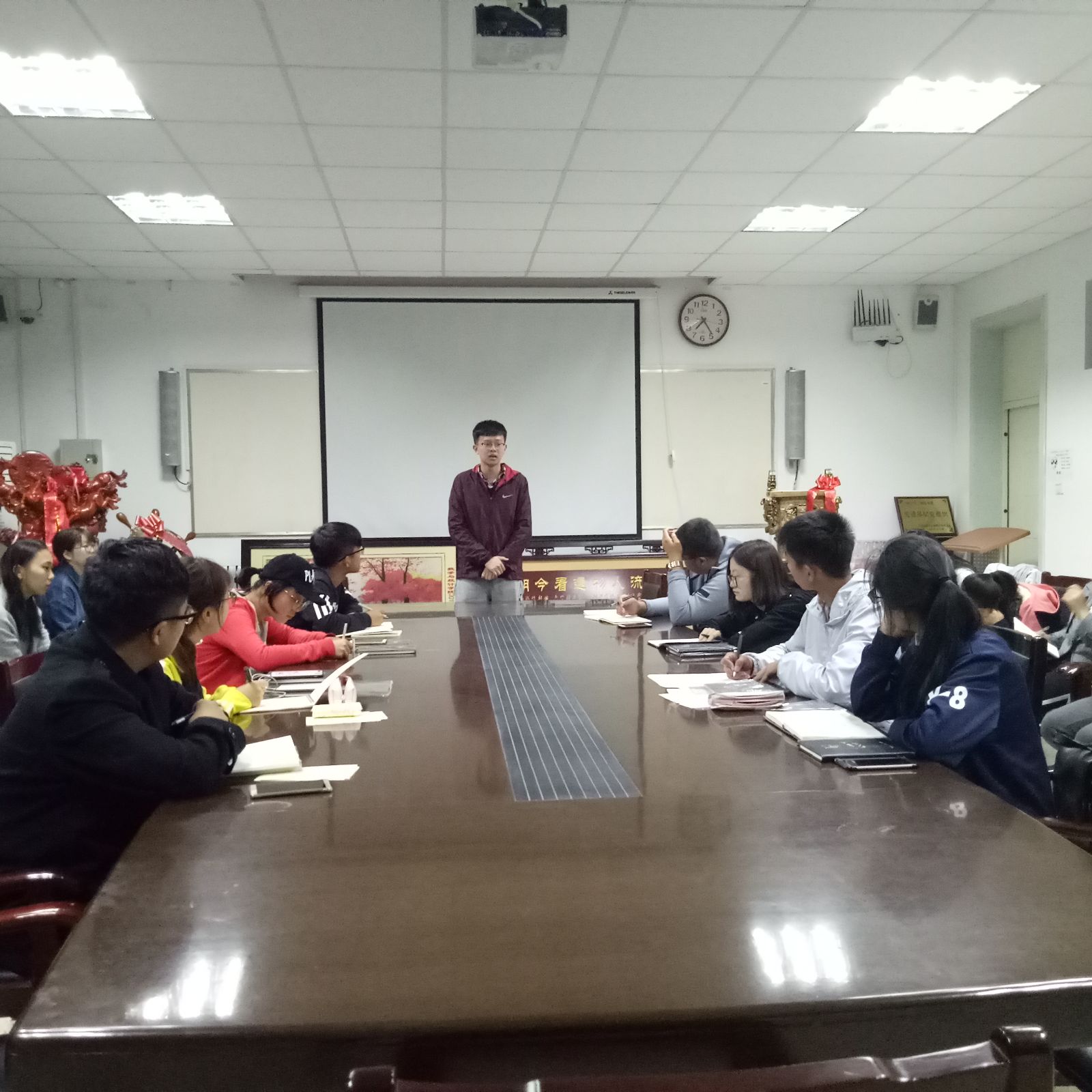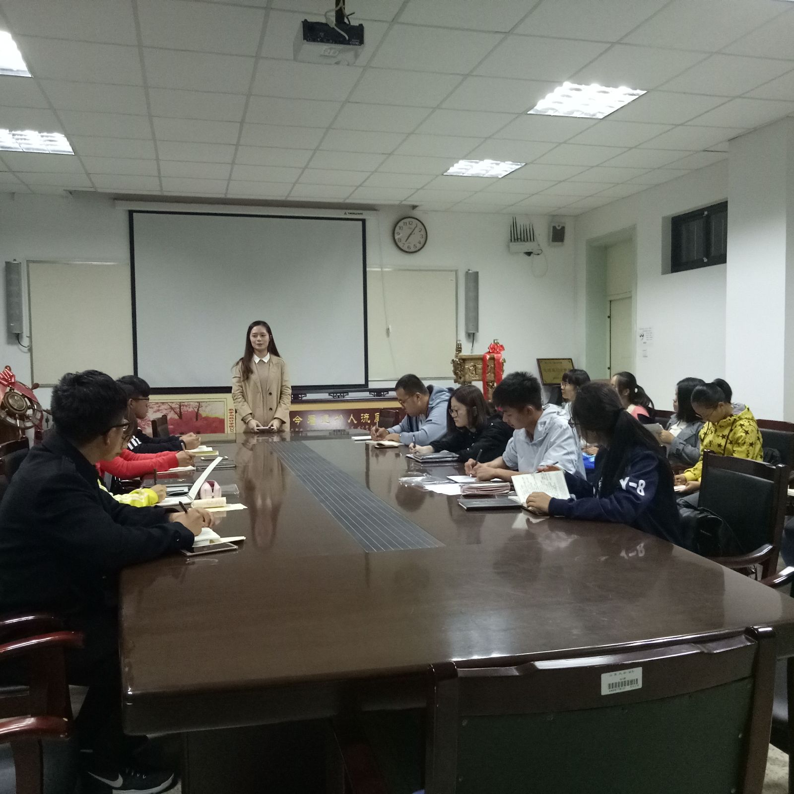 本站讯 2017年10月21日晚,我院2017-2018学年第一学期学生干部培训会在数院208成功举办。学院2017级各班班长、团支书、宣传委员和组织委员参与了本次会议。会议由团总支副书记葛超主持。