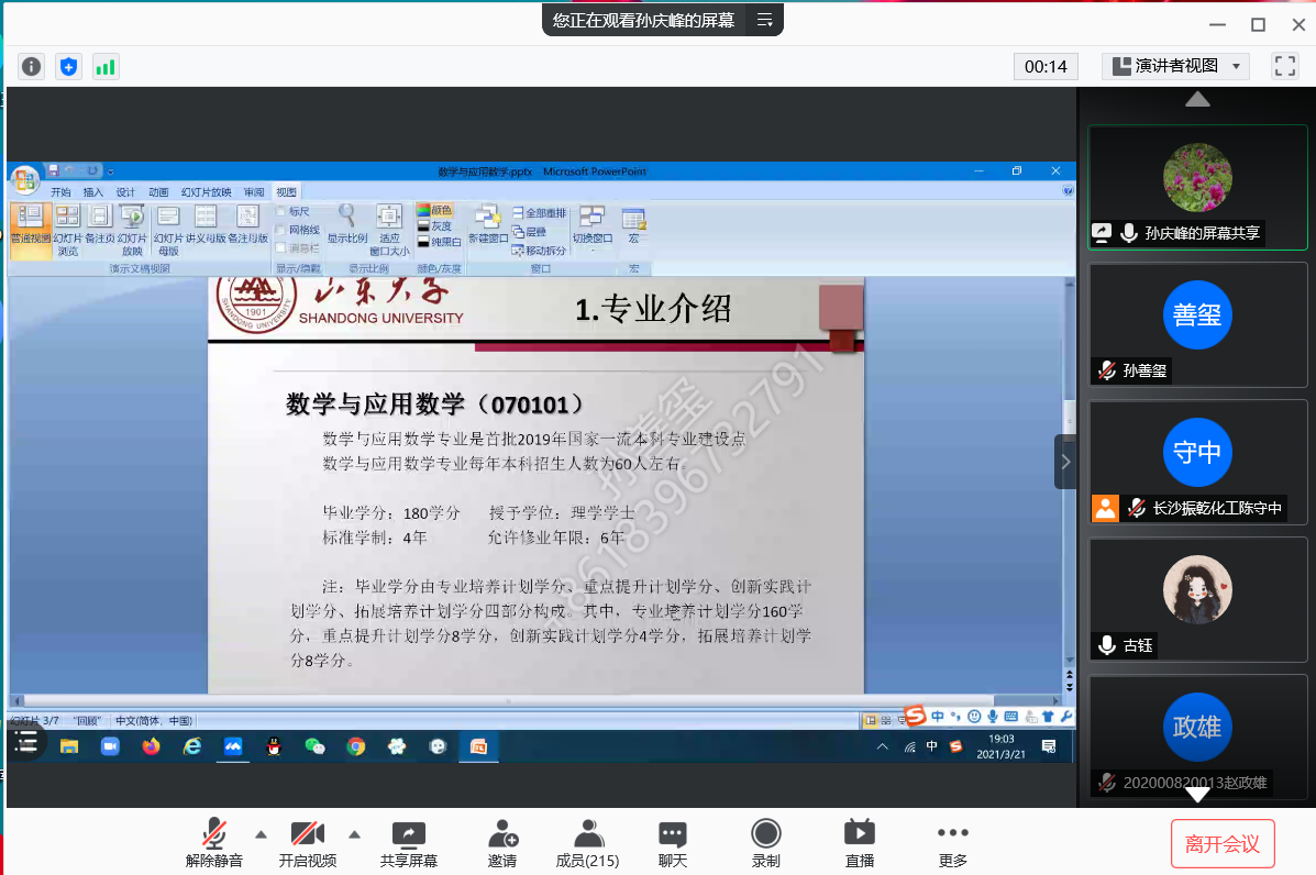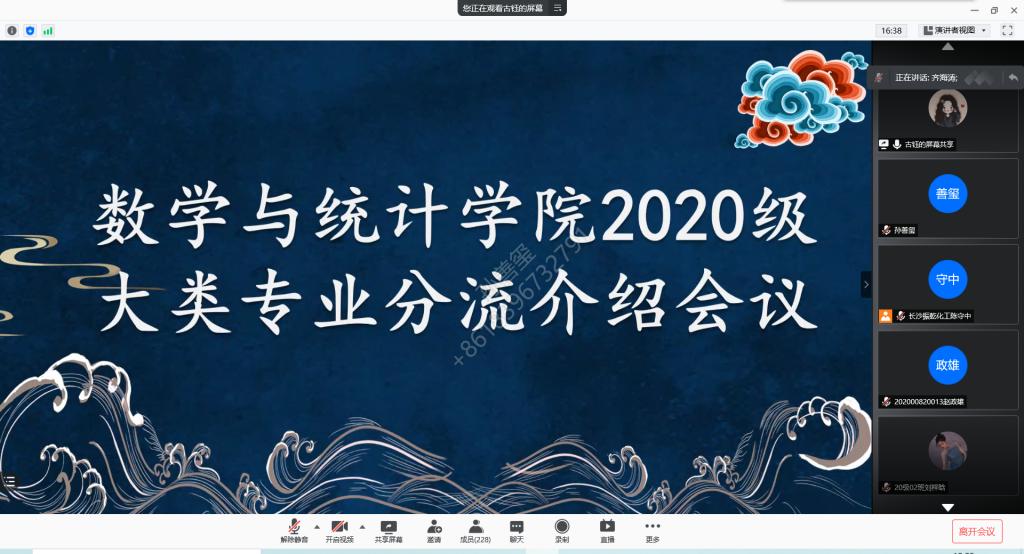 本站讯 3月21日,KY开元集团官网通过腾讯会议在线上举办2020级专业分流指导会。副院长齐海涛,数学与应用数学系主任孙庆峰、统计系主任王效强、信息与计算科学系主任张旭参加会议并作具体指导。指导会由2020级辅导员古钰主持。2020级全体本科生参加指导会。