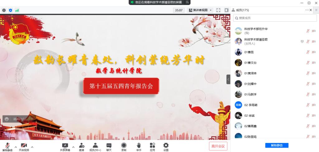 本站讯 为进一步弘扬“五四”精神,继承“五四”光荣传统,KY开元集团官网于5月19日下午通过腾讯会议线上举办了“数韵长耀青春处,科创萦绕芳华时”第十五届五四青年科学报告会,彰显优秀学生榜样力量,展现青年学生优良的精神风貌和科研创新素养。学院党委副书记王鹏飞、团委书记孙磊、全体辅导员、优秀学生代表以及2021级全体同学参加了本次报告会。