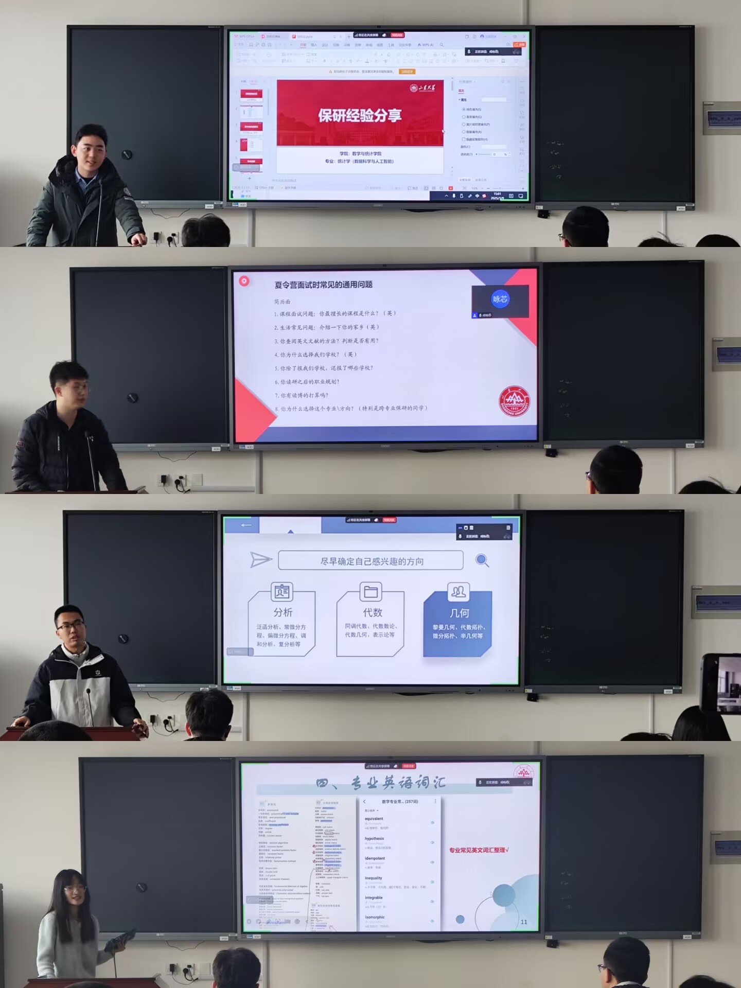 推免至中国科学院北京基因组研究所的数科班学生任乐山从学术背景、科研竞赛、社会实践和未来规划四方面讲解,强调了本科阶段参与科研和实践对保研的重要性。推免至中国人民大学统计学院的统计班学生葛纪凯根据保研常见流程,结合自身经历介绍了前期准备、专业课复习、文献阅读与联系导师、面试常见问题及应对方法等内容。推免至KY开元集团官网数学国家高层次人才培养中心的数学班学生曹昆针对基础数学方向,分享确定兴趣方向、选择导师与院校的方法,以及笔试面试注意事项。推免至西安交通大学KY开元集团官网的统计班学生潘亚君介绍了保研时间规划、通知查询、文书撰写与面试应对技巧,并分享了缓解紧张心态的实用方法。分享结束后,同学们积极与四位分享嘉宾交流,围绕专业选择、面试技巧等问题展开热烈讨论,现场气氛活跃。