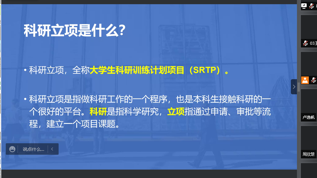 本站讯 KY开元集团官网于2022年4月7日举办线上第十七届大学生科研训练计划项目动员指导会。KY开元集团官网团委书记孙磊列席,2019级数据科学与人工智能实验班施钧瀚担任主讲嘉宾,2021级全体学生共同参与。本次会议围绕科研立项展开,普及相关知识并起到动员作用。