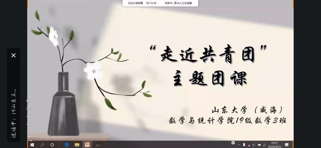 本站讯 4月25日晚19:30,19级数学3班举办“走近共青团”主题团课活动,本次活动通过线上连线的方式开展,由团支书王肖晴发起,团支部委员协助策划举办,19级数学3班团员应到51人,实到44人。