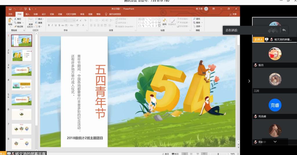 本站讯 2020年5月4日上午10点,2018级统计学二班于腾讯会议举办“五四青年节”主题班会。本次班会由团支书杨文涛主持,辅导员孙磊,2018级统计学二班全体同学参加。