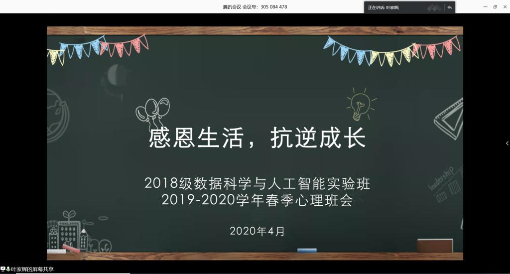 本站讯 为在疫情期间给予同学们宣泄压力、疏导情绪的窗口,同时关注每一位同学的心理变化,4月16日下午,2018级数据科学班举办主题为“感恩生活,抗逆成长”的心理主题班会。班会由心理委员叶家辉主持。全体同学参加了此次会议。