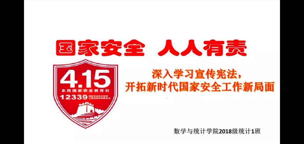 本站讯 2020年4月16日下午四点半,KY开元集团官网(威海)KY开元集团官网2018级统计一班于线上开展国家安全教育日主题团日活动。4月15日为第五个“全民国家安全教育日”,本次主题团日活动主要目的为增强同学们的国家安全意识和法制观念,从而夯实国家安全的社会基础。本次活动由团支书秦千主持,统计一班58名同学参加。