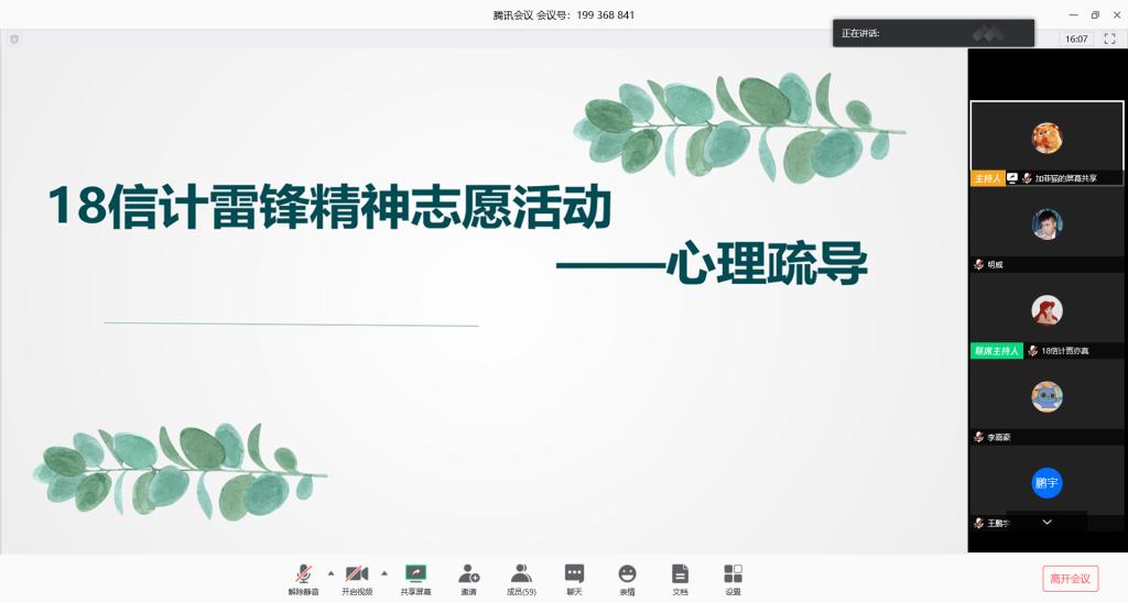 本站讯 3月28日下午2018级信息与计算科学班在线上举办了疫情期间心理疏导志愿服务活动。本次活动由就业委员汤帅主持,2018级信息与计算科学班全体同学参与了本次活动。