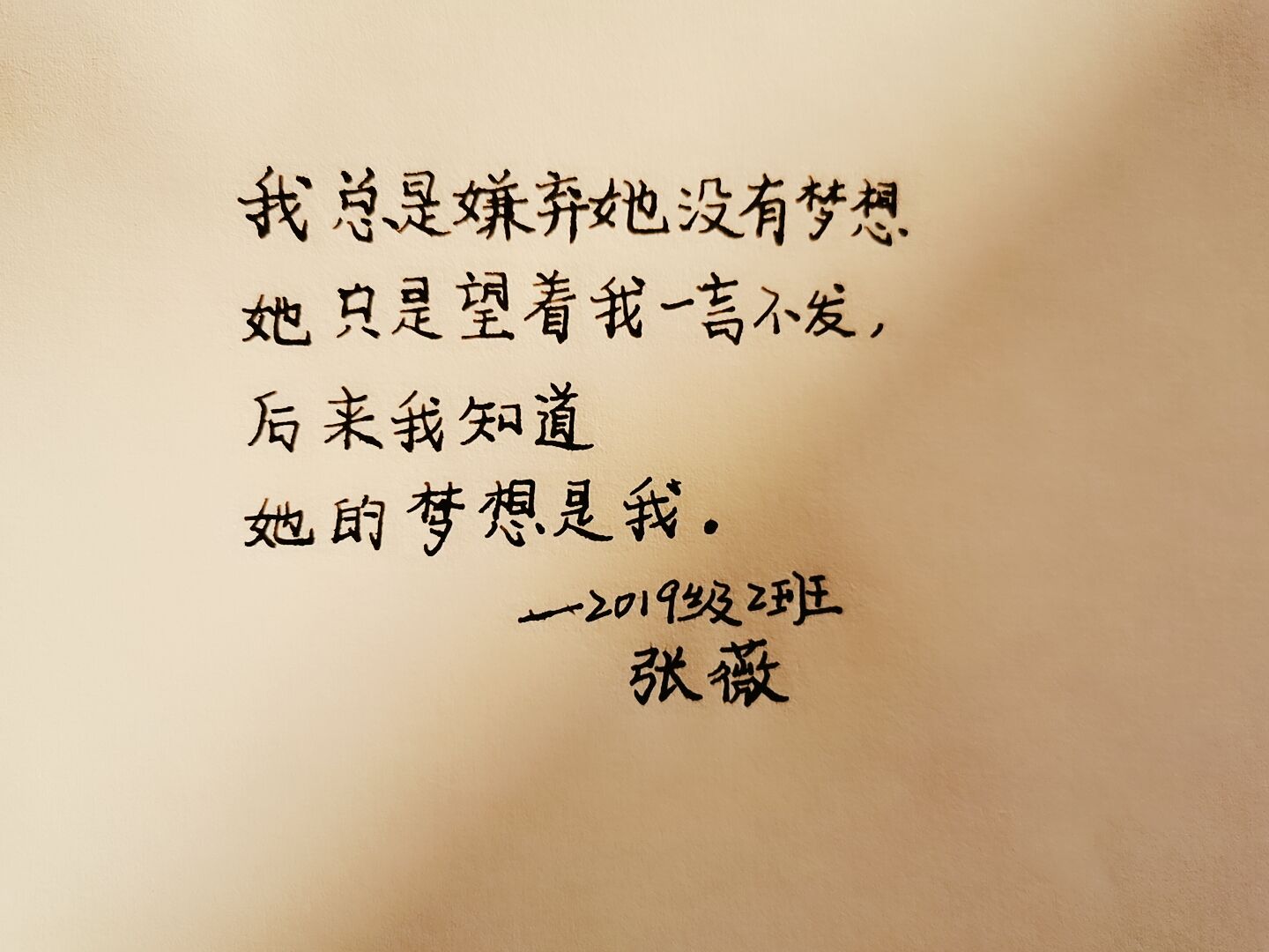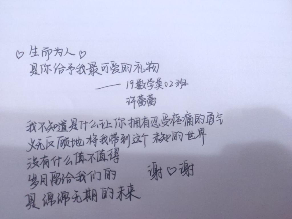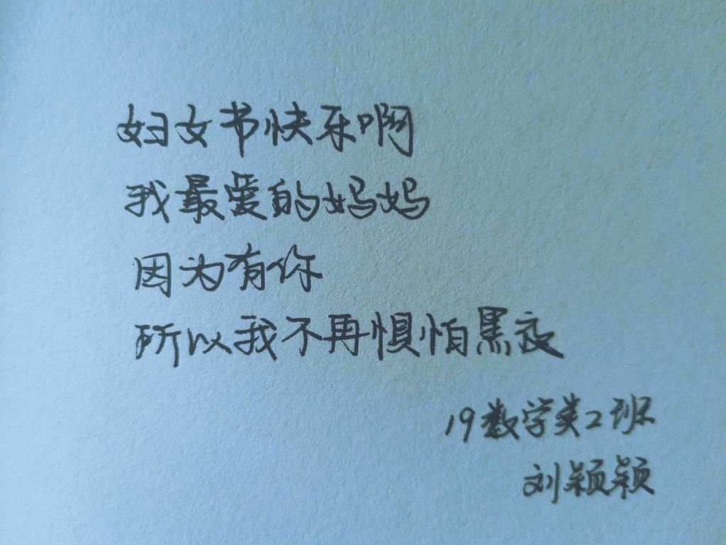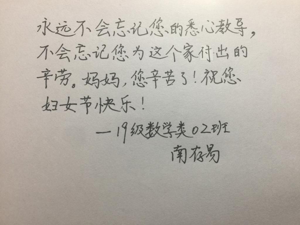 2020年3月7日,2019级数学2班就业委员王晨湾在班群中提出“祝母亲妇女节快乐”手写祝福活动的要求——每人手写小诗或祝福语送给母亲,并且主动积极地分担母亲的工作,让母亲度过一个她心中最轻松的妇女节。此活动开展之初,便有同学文思泉涌,写下对母亲的爱与祝福,纷纷将自己写的祝福语拍照上传网络分享,营造了感激母亲的良好氛围。在3月8日,同学们都把自己写下的祝福语送给母亲,表达对母亲的爱与感激之情。同时,大部分同学都能主动积极地分担母亲的工作,让母亲感受到我们的爱与尊重、这个世界的爱与尊重,在妇女节这一天能够感到骄傲与自豪。