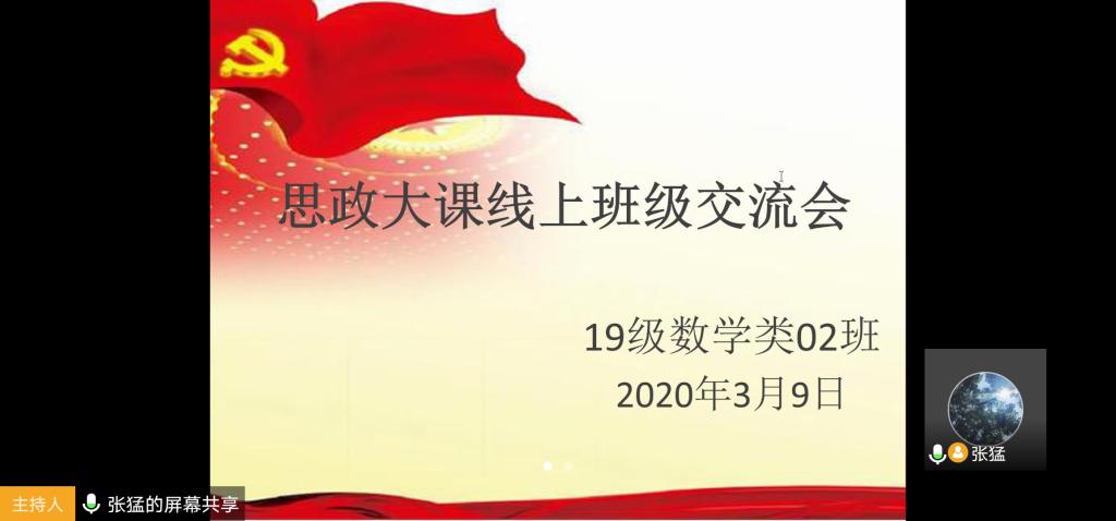 本站讯 2020年3月9日下午,“全国大学生疫情防控思政大课”结束后,KY开元集团官网2019级数学02班通过腾讯会议线上直播,开展了寒假“疫情防控思政大课感悟与总结”主题班会。班长张猛主持此次班会,KY开元集团官网2019级辅导员王祎璠、2班全体同学参加。