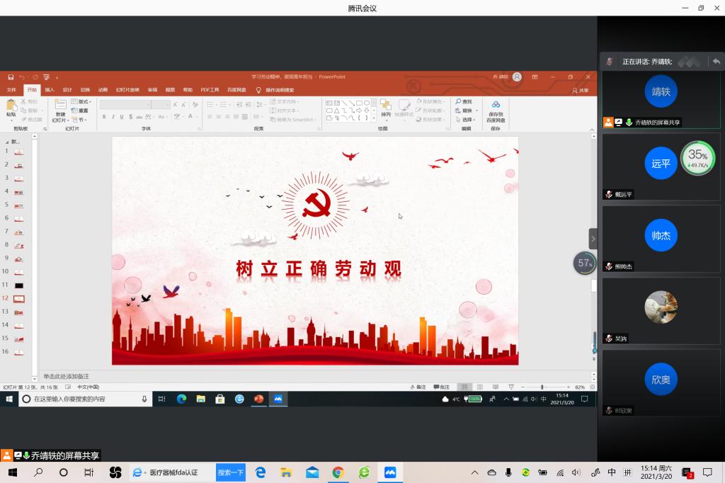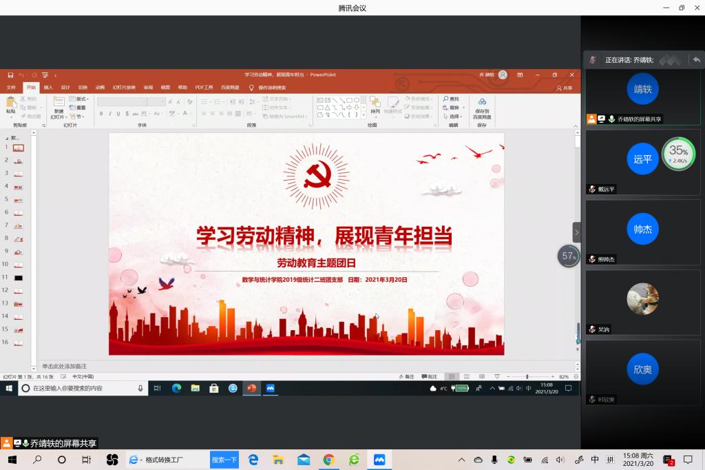 本站讯 3月20日下午15:00,KY开元集团官网2019级统计学二班开展“学习劳动精神,展现青年担当”主题团日活动,本次主题团日活动以线上会议的形式进行。本次会议由团支书乔靖轶主持,2019级统计二班全体同学参加。