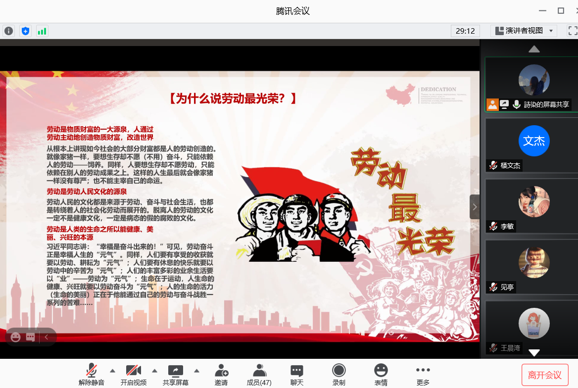 本站讯 2021年3月19日下午,2019级统计一班通过腾讯会议举行“弘扬新时代劳动精神”雷锋月主题团日活动。该会议由团支书张雅齐主持,班级全体同学参加。