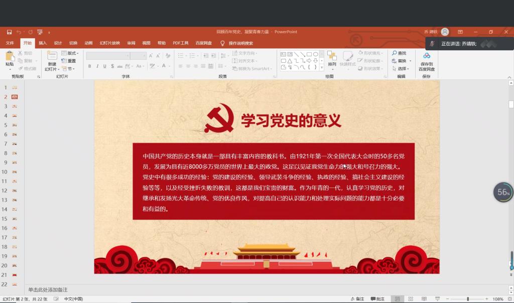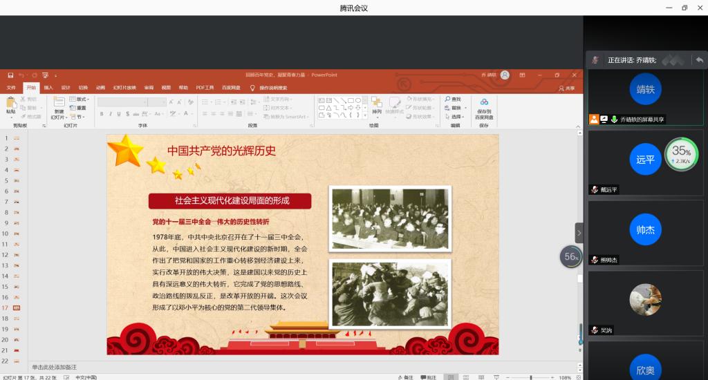 本站讯 3月24日下午17:00,KY开元集团官网2019级统计学二班开展“回顾百年党史,凝聚青春力量”主题团日活动,本次主题团日活动以线上会议的形式进行。本次会议由团支书乔靖轶主持,2019级统计二班全体同学参加了本次活动。