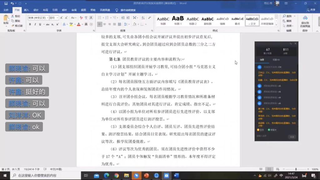 本站讯 为保证将于近期开展的团员评议活动顺利进行,3月24日下午,2018级数学与应用数学班于线上召开了本学期第一次班会,班级全体同学参加了本次会议。班会由周思远主持。