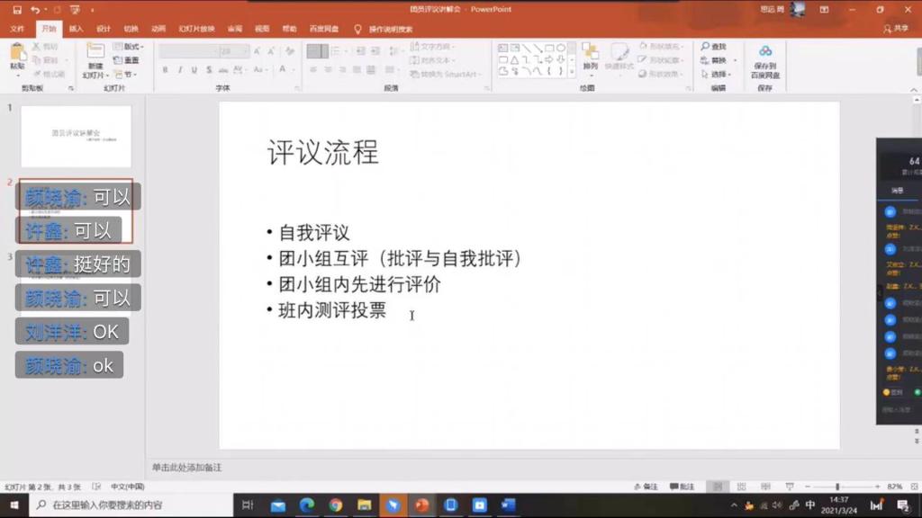 班会伊始,周思远向同学们大致介绍了团员评议的目的,通过开展团员评议,提高团员的政治素质和思想素质,进一步激励团员在学习工作中发挥的模范作用,同时严肃团纪,保证团支部成员履行团员义务,主动承担团员责任。同时说明了本次团员评议的重要性,提醒同学们要重视本次评议。接着,周思远对评议流程做了系统介绍,着重强调了在评议内容和评议方式上与去年相比的不同之处,提醒同学们注意评议标准的变化。鉴于之前评议过程中部分团小组的操作流程有不规范之处,周思远梳理了团小组评议方式,并提醒各团小组组长要多干预引导团小组评议过程。班会最后,周思远给各团小组组长与舍长分派任务,进行评议前的信息采集以及评议后的材料收取工作。
