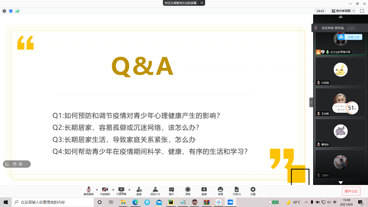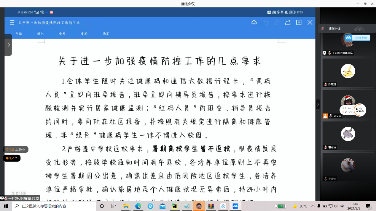本站讯 为响应国家疫情防控政策,落实疫情防控工作,提高同学们暑假期间疫情防控意识,8月8日晚,KY开元集团官网2020级数据科学与人工智能实验班召开了疫情防控暨心理健康安全线上班会。本次班会由生活委员王启帆、心理委员刘文垚主持,2020级数据科学与人工智能实验班全体同学参与。