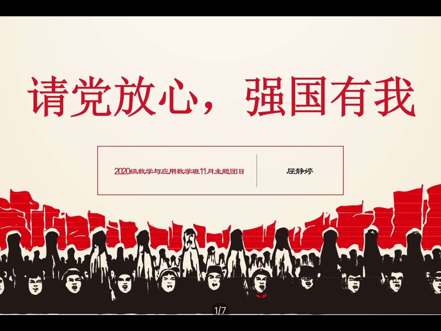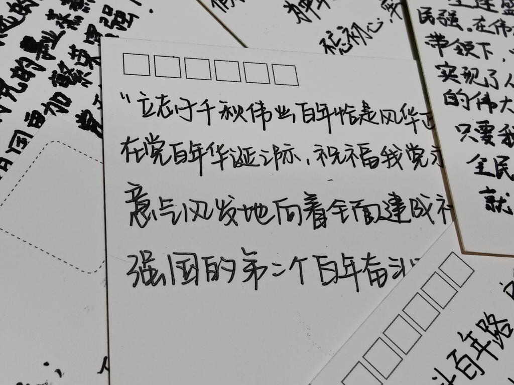 10月25日,全体同学在各宿舍长的组织下集体观看视频《社会主义“有点潮”》和《科学家的故事》钱学森篇。通过观看视频,同学们从不同的角度了解社会主义,深切地感受到社会主义的新鲜和美好。10月26日上午,团支部举办“请党放心,强国有我”线上交流会,围绕点亮理想之灯、笃立鸿鹄之志、激昂青春梦想三个方面展开。屈静婷列举了中国当代青年杰出代表,全体同学认识到新时代青年的责任与担当。会议临近结束,屈静婷总结近几周青年大学习学习成果,指出每周完成率均为100%,希望同学们继续保持。10月26日下午,团支部举办线上分享会,同学们积极发言,分享自己身边的青年优秀事迹,凝聚榜样力量。10月26日晚,班长李彦青与团支书屈静婷分别在男女宿舍组织观看电影《1921》,感受百年前的那段历史,体会中国共产党人的建党精神。10月27日,全体支部成员以联合签名承诺书的方式,宣告青春誓言“请党放心,强国有我”。其后,以入党积极分子为表率,支部组织“建党百年,我想对党说”手写贺卡活动,同学们积极参与,书写祝福与感谢。