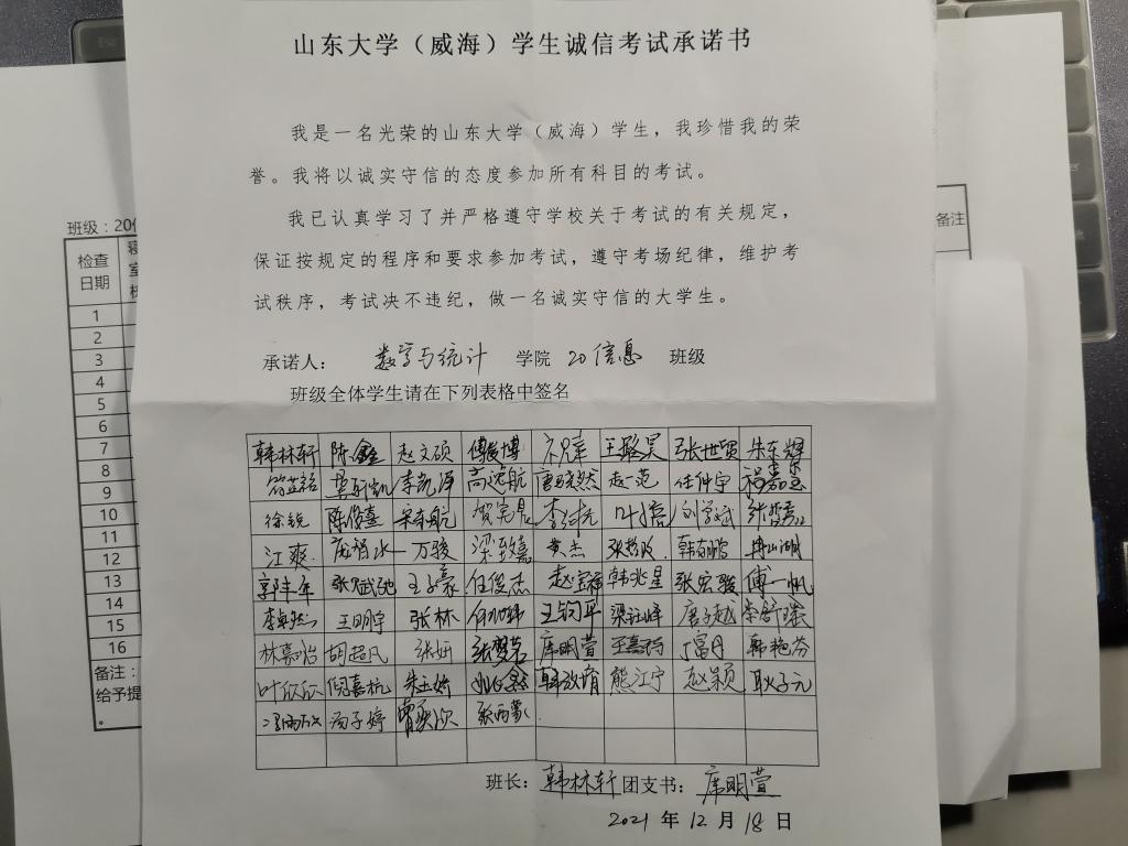 首先,韩林轩向同学们说明了诚信考试的重要性。诚信考试是为了通过考试培养学生的诚信品质,让学生排除外界干扰,正确认识考试对评价自己的重要性。韩林轩带领同学们学习了《普通高等学校学生管理规定》《KY开元集团官网(威海)学生违纪处分实施细则》文件中关于考试违纪行为的相关规定,阐述了考试作弊的危害,指出考试作弊的相关处分,以及处分对今后学习与发展的影响,告诫大家不要出现考试违规行为,重视诚信,提醒同学们认真备考。班会结束后,韩林轩组织同学们签署了诚信考试承诺书,要求同学们端正考试态度,诚信考试,确保考试的公平性,共同建设KY开元集团官网和信息与计算科学班的良好学风。