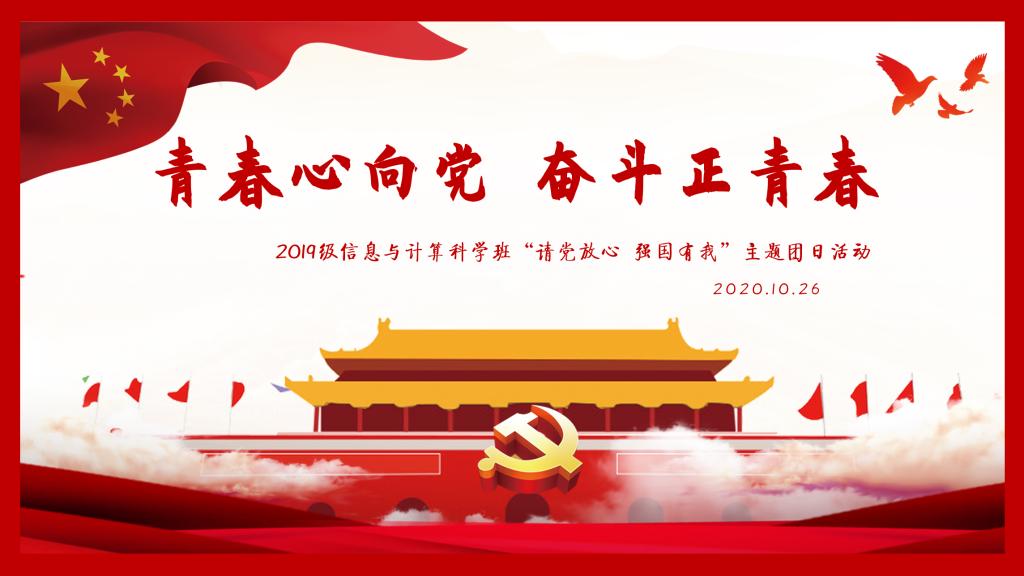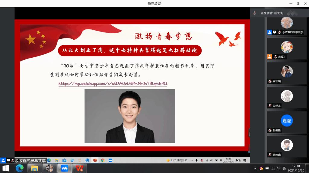 本站讯 2021年10月26日下午16:30,KY开元集团官网2019级信息与计算科学班于腾讯会议举办“青春心向党 奋斗正青春——请党放心 强国有我”主题团日活动。本次活动由信息与计算科学班团支书王肖晴发起,团支部委员共同筹备组织,由团支书王肖晴、班长赵大成和组织委员赵新宇共同主持,团支部共53人参加,辅导员王祎璠列席参加。