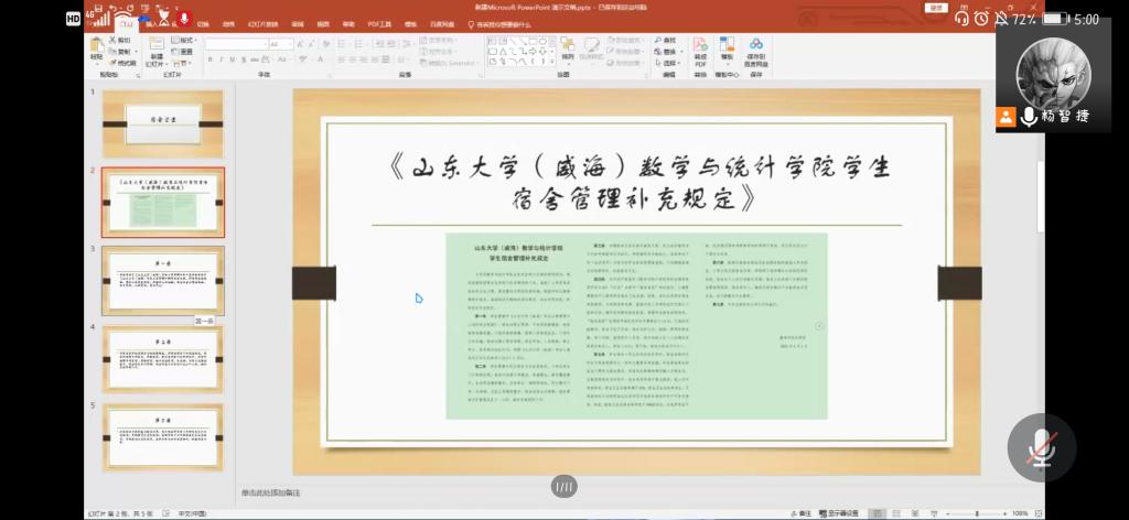 杨智捷首先强调了召开此次班会的背景——由于最近宿舍违规使用电器事件频繁发生,为保护同学们的生命财产安全,营造整洁文明的宿舍环境,特召开此次主题班会。在简单说明原因后,杨智捷向大家介绍了《KY开元集团官网(威海)KY开元集团官网学生宿舍管理补充规定》,并对前三条进行重点说明。此外,他强调在学生推优入党以及各类评奖评优中,宿舍表现作为学生日常表现要求之一将作为重要参考依据,并提醒同学们辅导员将定期与不合格宿舍成员谈话,进行提醒及口头教育。随后,王肖晴进行补充,并针对“我为青年做件事”问题征集活动、青年大学习完成积极性以及“庆祝建党百年 展现青春担当”升国旗主题团日活动三个事情进行了简单说明及动员。